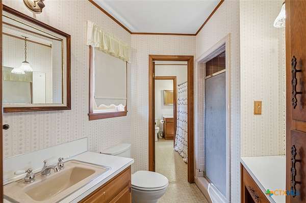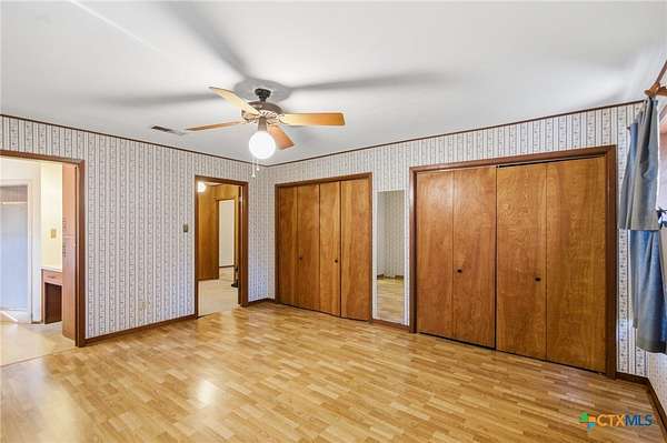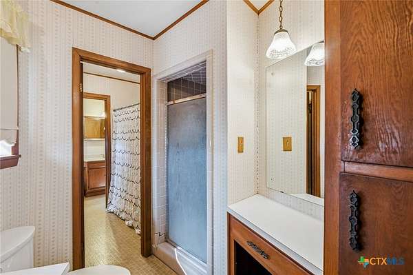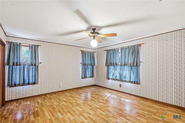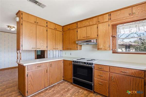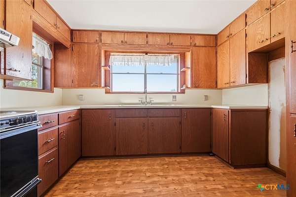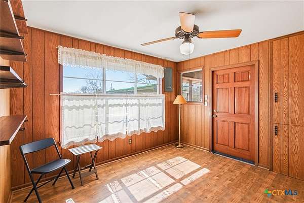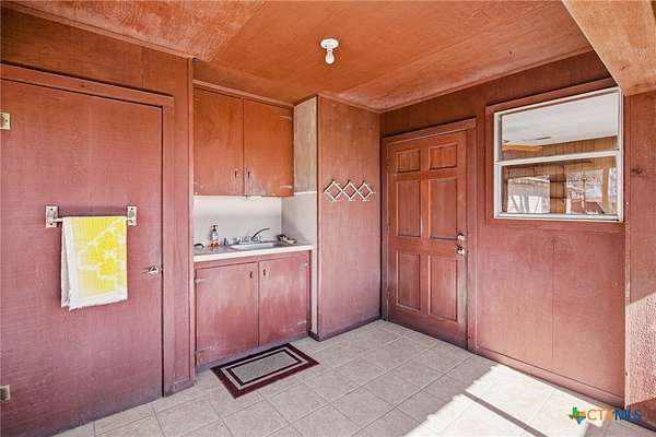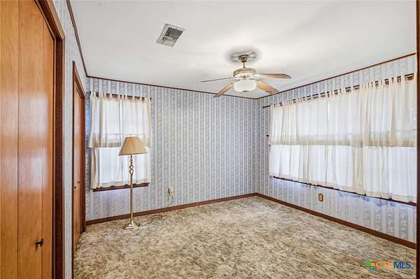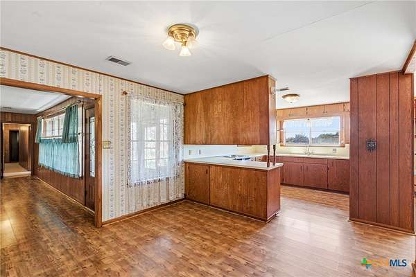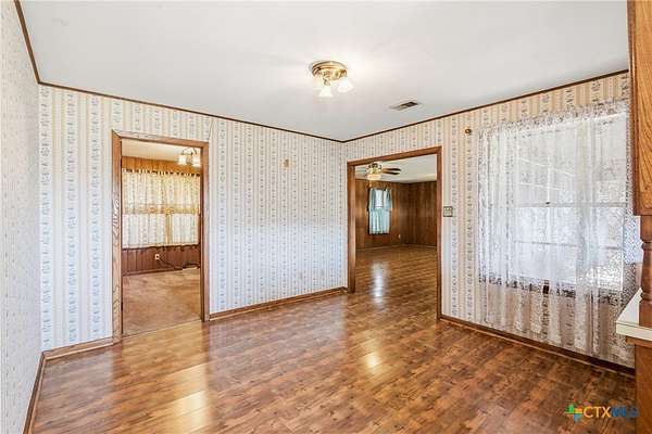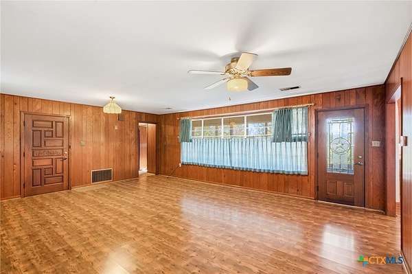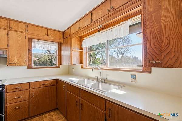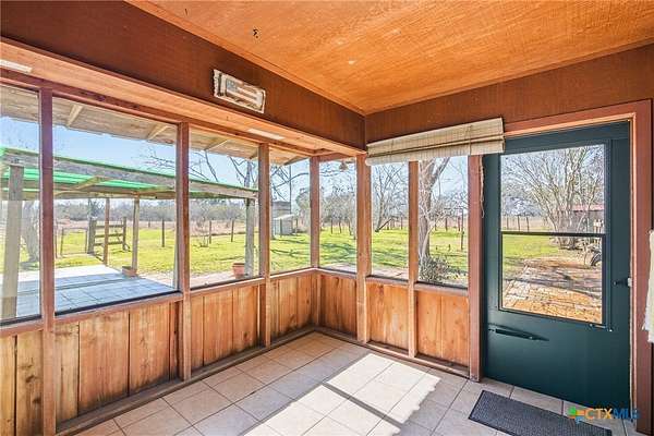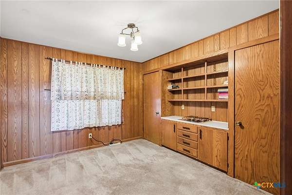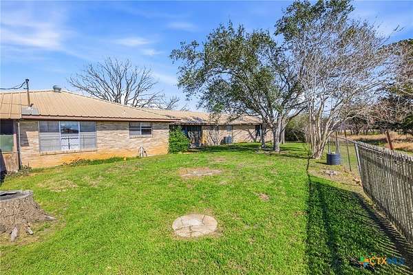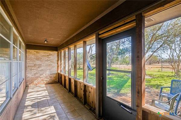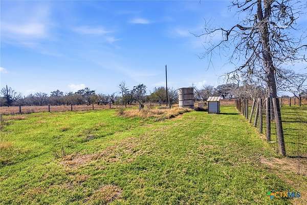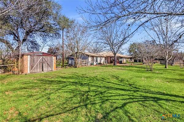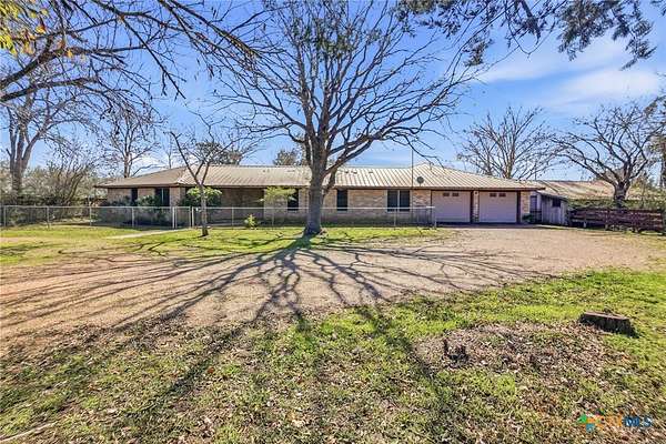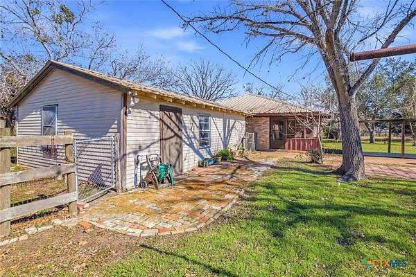 Welcome to this charming 3-bedroom, 2-bath ranch-style home situated on approximately 2 acres just outside the Yoakum city limits and only minutes from Shiner, TX. A rustic flagstone walkway leads to the inviting covered front porch, setting the tone for the warmth found throughout the home. The spacious living room, filled with natural light and offering views of the enclosed back porch, creates a comfortable gathering space for family and friends. The kitchen features a mid-century modern feel with clean lines, warm wood cabinetry, and light countertops that brighten the space, flowing seamlessly into the dining area. Adjacent to the kitchen is a breakfast nook, ideal for casual meals and everyday dining. A wood-paneled home office with built-ins and two closets offers flexible use and could serve as a fourth bedroom if desired. The primary suite offers generous closet space and a private bath with a built-in vanity and separate shower, creating a comfortable retreat at the end of the day. A conjoining door in the primary bathroom offers easy access to the second bathroom & soaking tub. Additionally, a two-car garage, a covered patio ideal for outdoor gatherings, a second enclosed porch just off the breakfast nook, and a second detached workshop highlight this home. With open space, charm, and versatile rooms, this property offers peaceful country living with convenient access to town.
