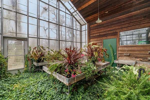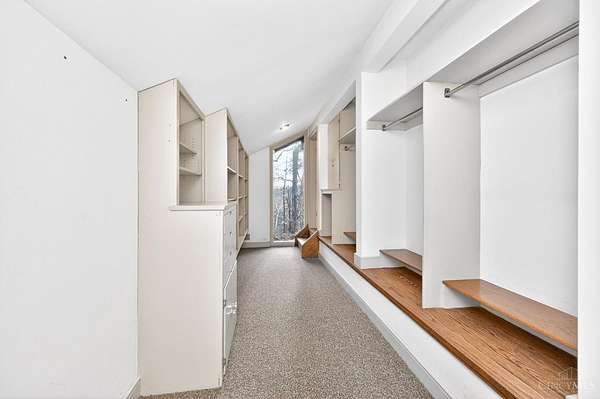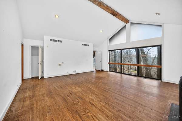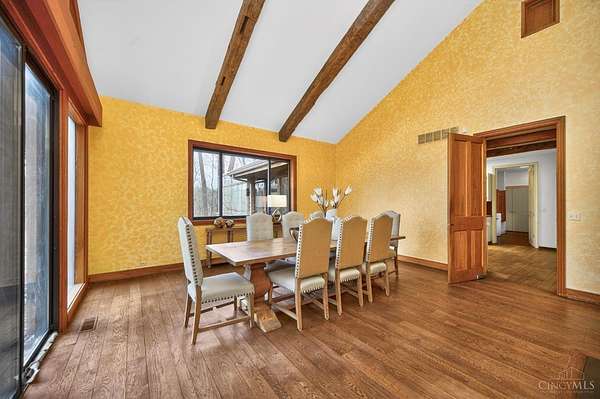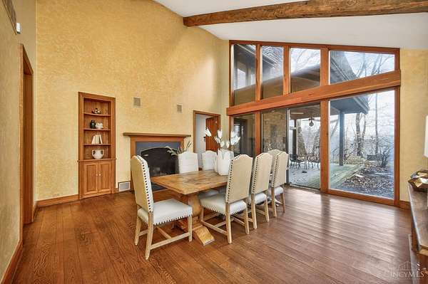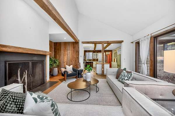 - 9 Ft + Ceiling, Beam Ceiling, French Doors, Multi Panel Doors, Natural Woodwork, Vaulted Ceiling