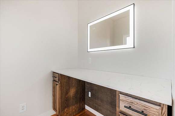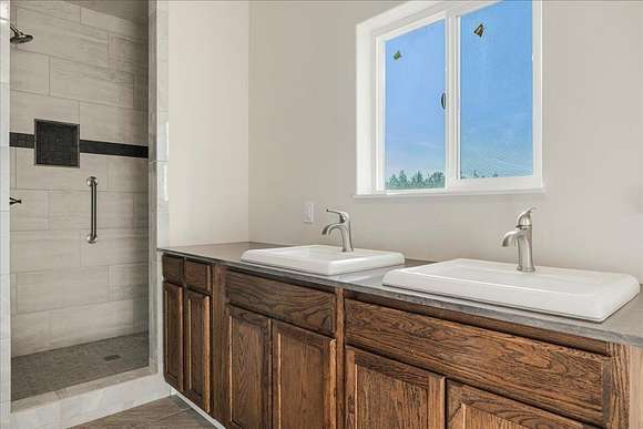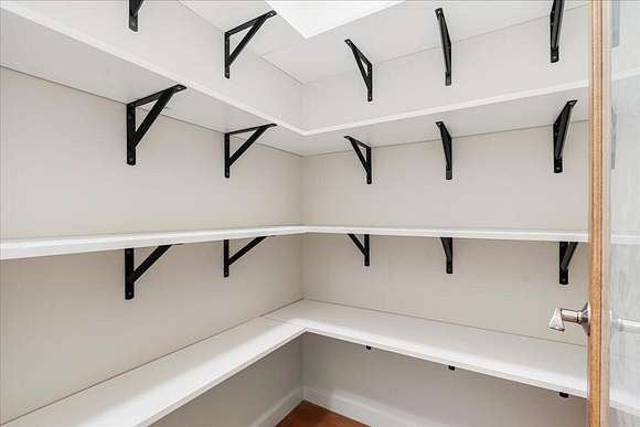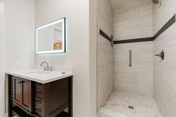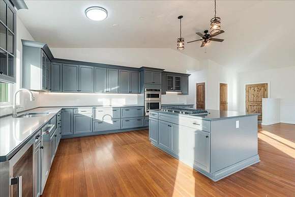 - Ceiling Fan(s), Double Vanity, Enclosed Toilet(s), Kitchen Island, Linen Closet, Open Floorplan, Pantry, Primary Downstairs, Solid Surface Counters, Tile Shower, Vaulted Ceiling(s), Wired For Sound
