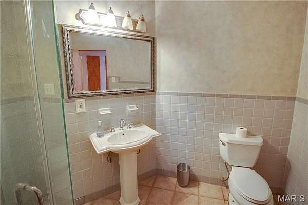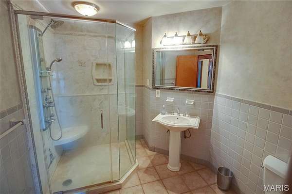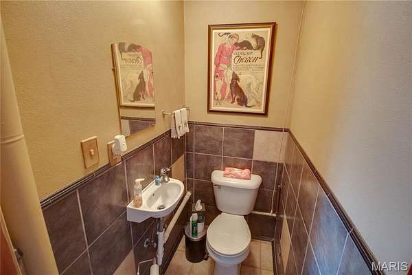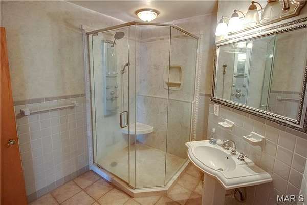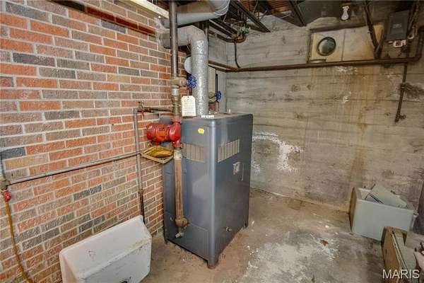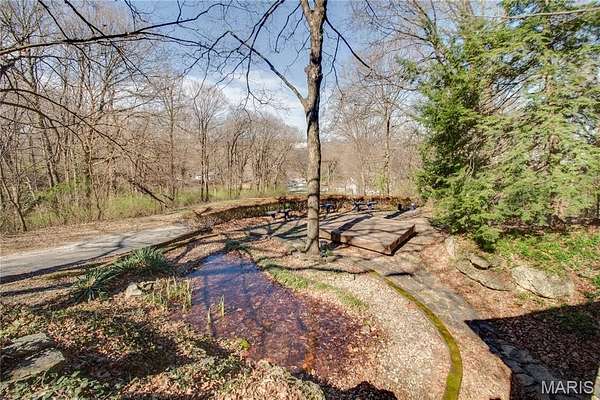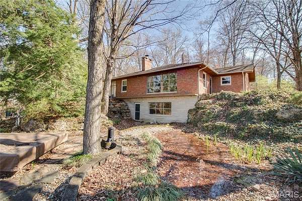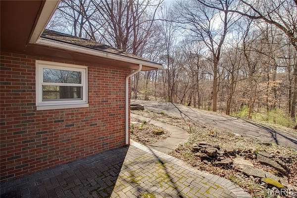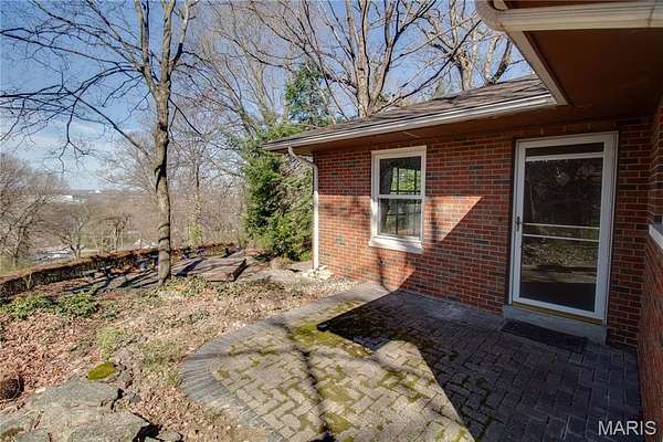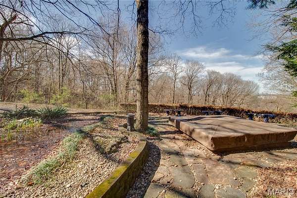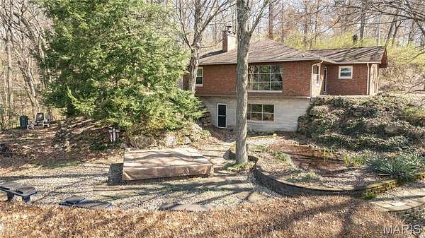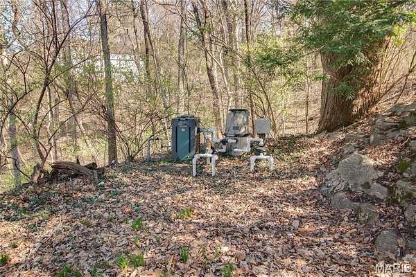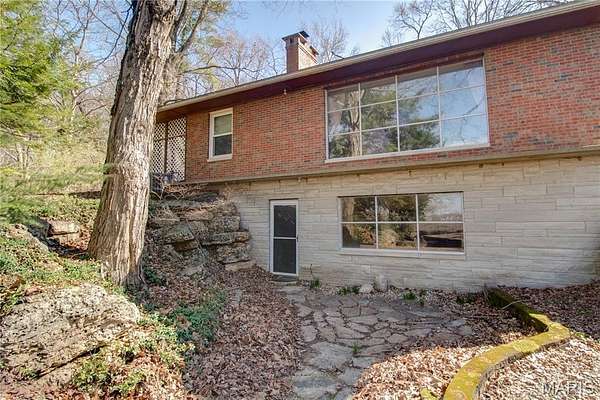 The walk-out lower level offers a partially finished family room with gas fireplace and access to a stone patio area overlooking the property with additional views of the St. Louis skyline. Outdoor features include a hot tub area (not currently functional) and decorative fish pond.