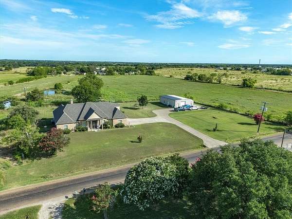 Welcome to country living with modern comfort--just 5 miles from downtown Kaufman, Tx! This custom-built 4-bedroom, 3.5-bath home is nestled on just over 10 acres outside the city limits and offers the ideal balance of space, style, and practicality. Inside, you'll find hand-scraped hardwood floors, a cozy wood-burning fireplace, and a spacious open layout perfect for everyday living or entertaining. The kitchen features antique-style custom cabinetry, a walk-in pantry, and flows seamlessly into the formal dining room. The oversized primary suite includes a jetted tub, separate shower, dual sinks, and a generous walk-in closet. Upstairs, a large game room offers flexible use as a fifth bedroom, office, or hobby space. This home is equipped with a 2-year-old roof and a Generac generator for added peace of mind. A finished-out metal building adds versatility, with a 540 sq ft front storage area and a 1,250 sq ft back area previously used as a residence--perfect for a home office, guest suite, or small business. The second building features new AC and septic systems. Both structures are powered by a single electric meter and supported by solar panels for improved energy efficiency. With no city restrictions and plenty of space to live, work, or play, this property is ready to meet your vision of country living.