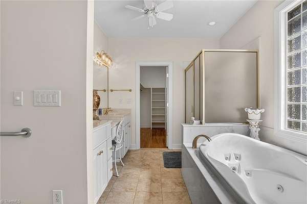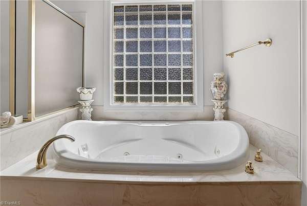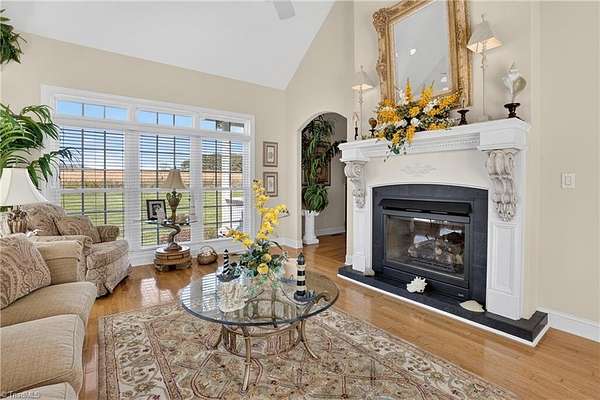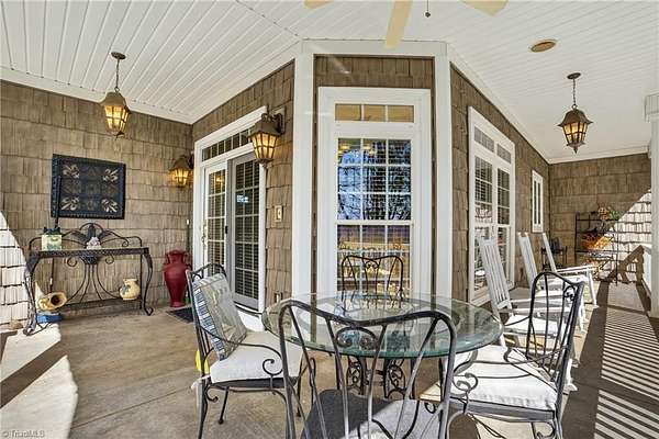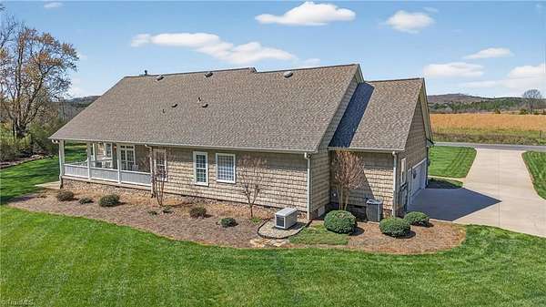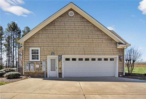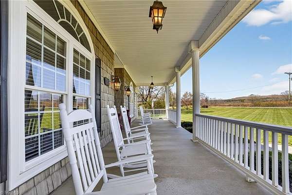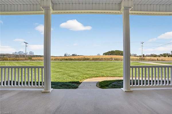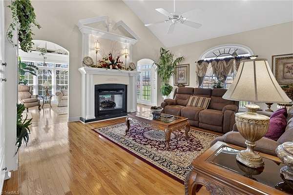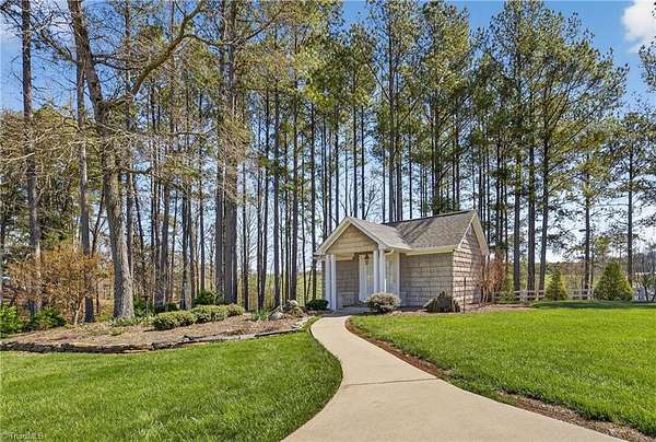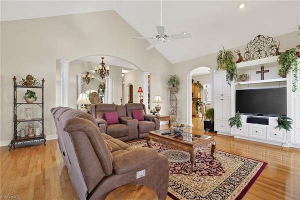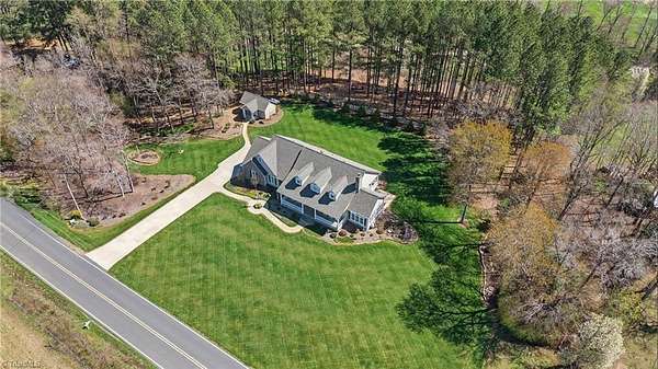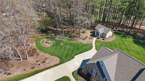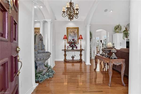 One of Randolph County’s most distinctive custom homes! Located in the New Hope area, this property showcases intentional design, elevated finishes, and unforgettable curb appeal. Beautiful landscaping creates a stunning first impression, leading into a grand interior entry with columns and a water fountain. Inside offers 10 ft ceilings throughout with a soaring 15 ft cathedral ceiling in the main living area, rich hardwood floors, custom archways with columns, and detailed built-ins throughout. A double-sided fireplace anchors both the indoor and outdoor living spaces. The kitchen features an oversized island, Italian granite, glass-front cabinetry, and abundant storage. Whole-home and porch speaker system. Primary suite with double tray ceiling. Wheelchair accessible. Minutes to Uwharrie and nearby lakes.