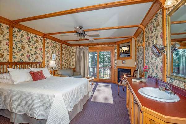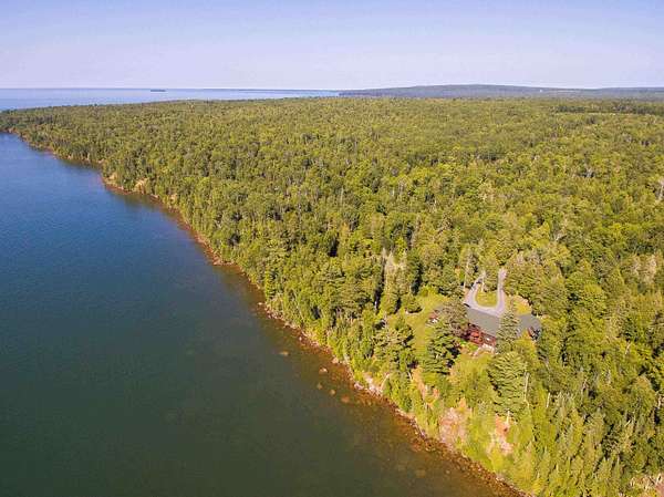 Experience ultimate privacy and tranquility on 300 ft of Lake Superior shoreline at this estate nestled amid old-growth forest. Situated on a sprawling, landscaped lot, the home features historic brownstone pillars quarried in 1892 and a spectacular Edwardian cottage interior with detailed woodwork sourced from the property. Enjoy en suite bedrooms with fireplaces, luxurious baths, and lakefront decks/views. The gourmet kitchen boasts granite countertops and premium appliances. Additional highlights include a sunroom/library, lower-level family room, fitness area with sauna, and beautifully lit gardens overlooking Siskiwit Bay. Immaculately maintained, this exceptional retreat blends timeless elegance and modern comfort. Additional 5 acres on Lake Superior available for $499,900. Business can be purchased at an additional price.