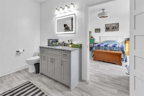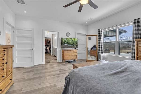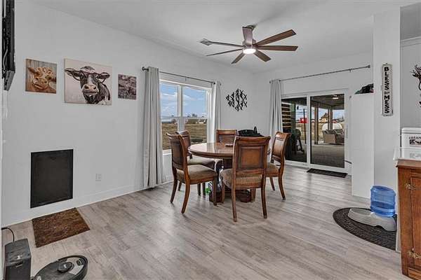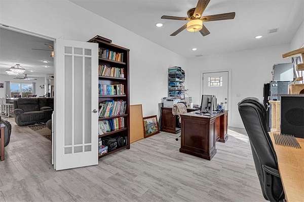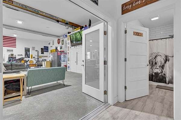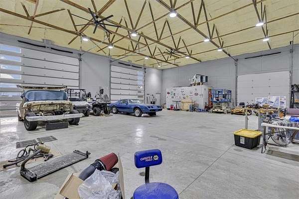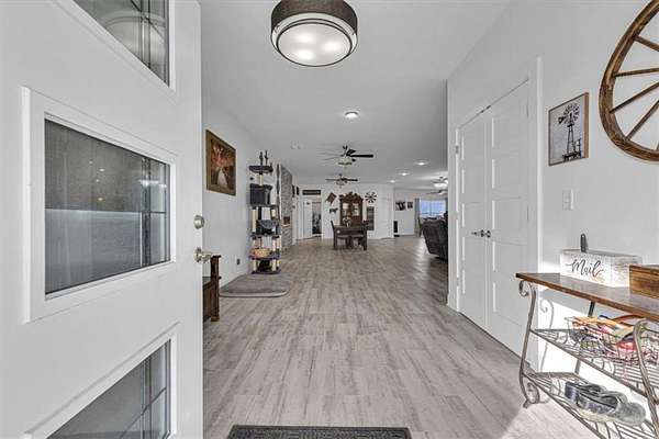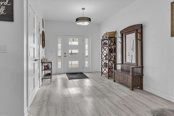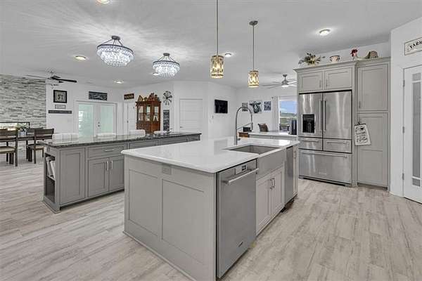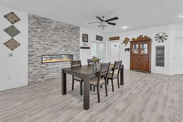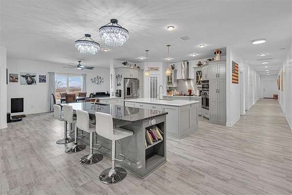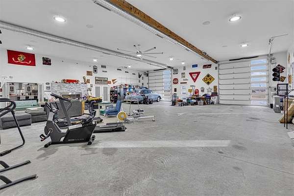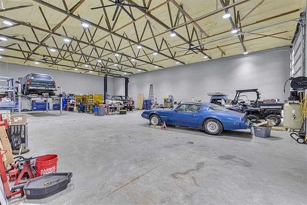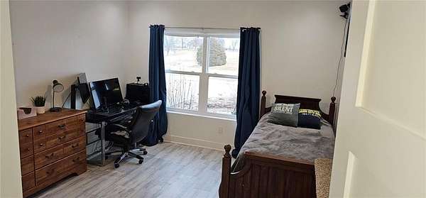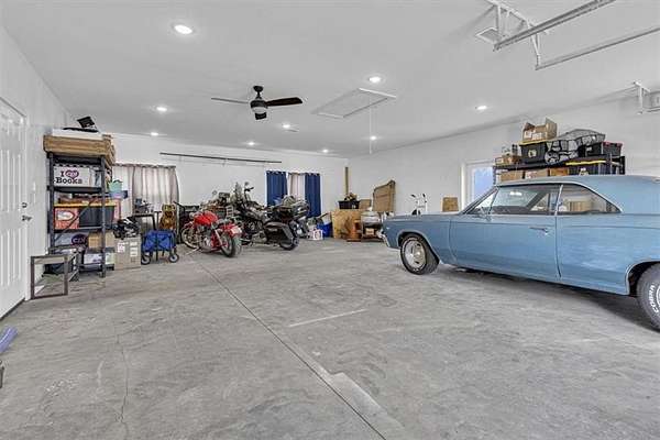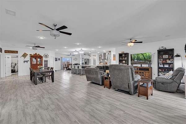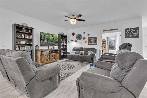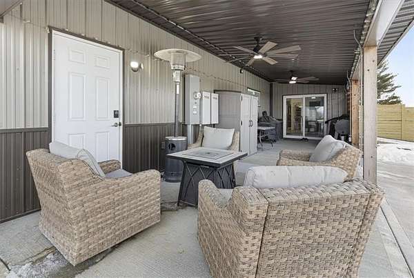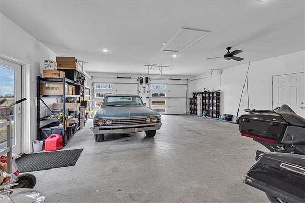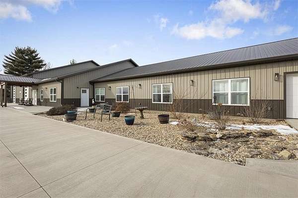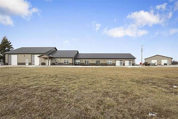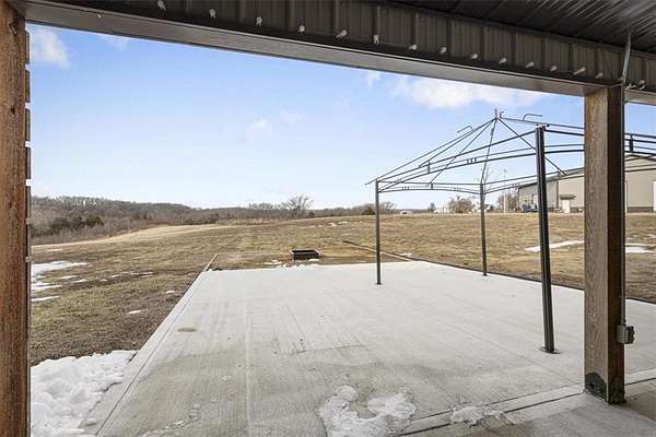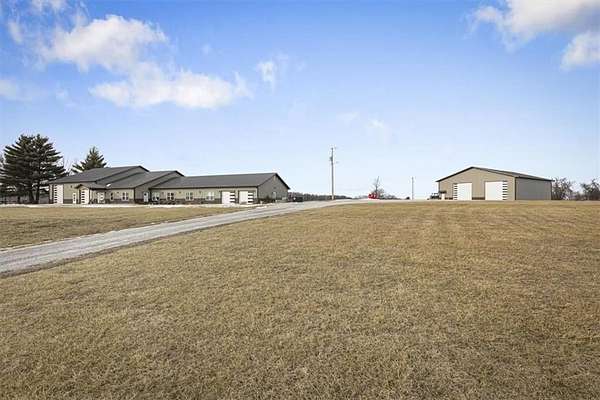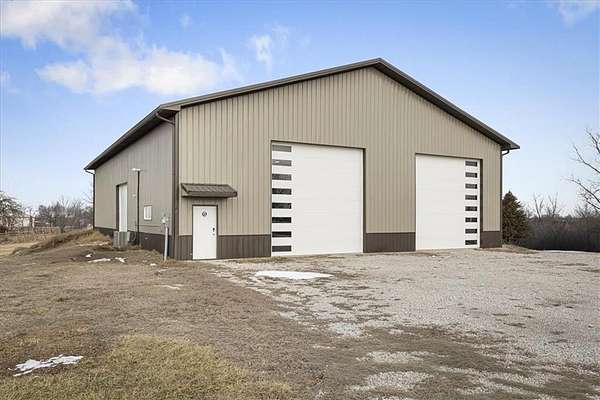 Rare opportunity to own a turnkey mixed-use property just 7 minutes from Richmond and 40 minutes to Kansas City. This custom built 2022 ranch offers luxury finishes, low maintenance exterior, 4 bedrooms, 4 full baths, 9' ceilings, luxury vinyl flooring, a two-sided propane fireplace, smart programmable lighting inside & exterior, on demand hot water, water softener, ceiling fans throughout, and wide doorways with a 5' hallway for easy ADA friendly access from the private driveway to all living spaces. The chef's kitchen features a professional gas range, built-in oven & microwave, large island, 2 walk-in pantries, and wet bar island. A private office with an exterior entrance supports client-facing business use or could be used as a 5th bedroom. Thick spray foam insulation in the home, shop, and entertainment area delivers exceptional energy efficiency and low utility costs. The attached 50' x 60' climate-controlled barn dominium style recreation room includes separate HVAC, LED lighting, surround sound, media area, Big Ass fan, two 12' doors with openers, 6" concrete floors, and an indoor storm shelter; ideal for events, inventory, studio space, or operations. The 60' x 80' x 18' fully insulated workshop is truly commercial grade with 6" concrete floors, three oversized insulated doors (two 16', one 14'), 200 amp service with outlets every 10', 5 ton HVAC, LED lighting, ceiling fans, and a bathroom with hot and cold water on its own septic. Additional features include a whole-home Generac generator, a deep 25' x 36' garage with door openers, reinforced concrete driveway for semis, trailers, and equipment, ample parking, covered patio, new patio with gazebo, fenced yard with dog door, and peaceful acreage with room to grow. A rare combination of luxury living and fully finished, business ready infrastructure.