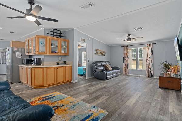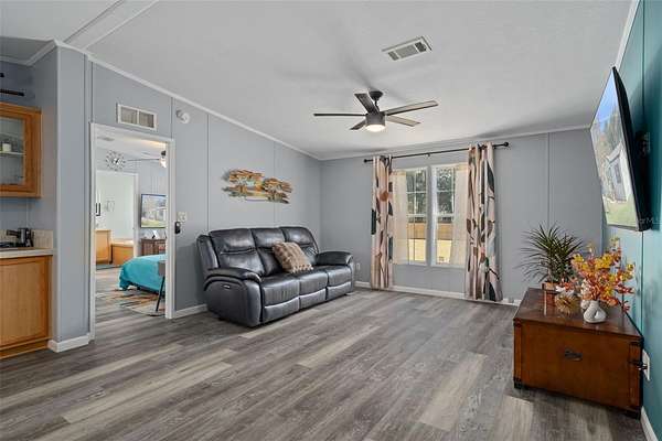 Welcome to this peaceful getaway on 5 beautiful acres in Bushnell. This move-in-ready 3 bedroom, 2 bathroom 2006 home has been thoughtfully maintained and updated with fresh exterior paint, a brand-new roof, new fencing, and a new hot water heater. Inside, you'll find inviting interior updates, a practical split floor plan, all new plumbing to all appliances , an inside laundry room, and a spacious 2-car carport with an attached porch for relaxing outdoors and enjoying the serene environment.