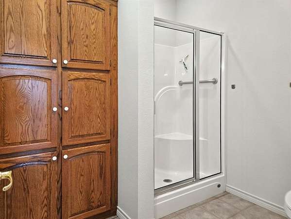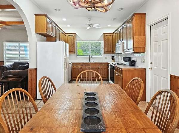 For outdoor entertaining, the backyard is an oasis! A spacious grilling and entertainment area is nestled and shaded by the property's mature oak trees, providing an ideal setting for gatherings.