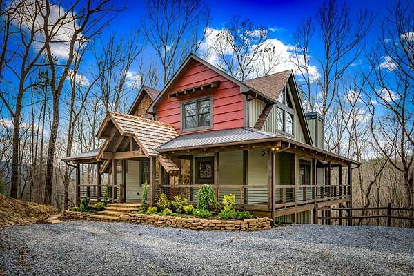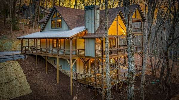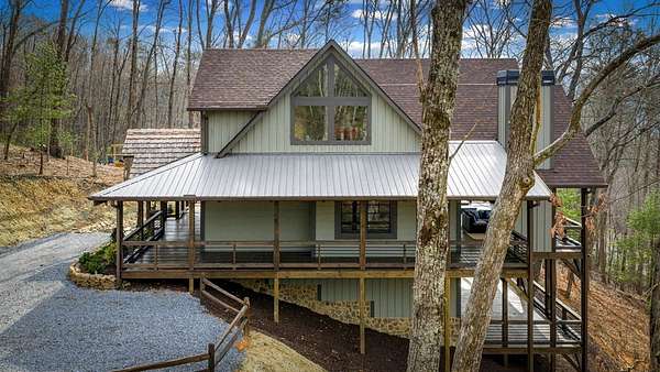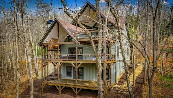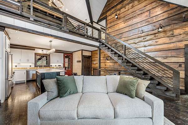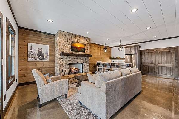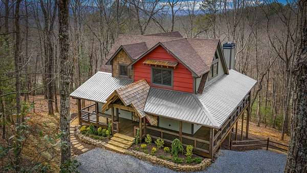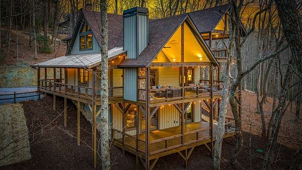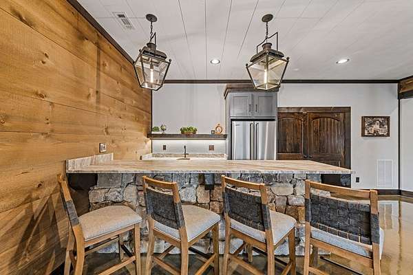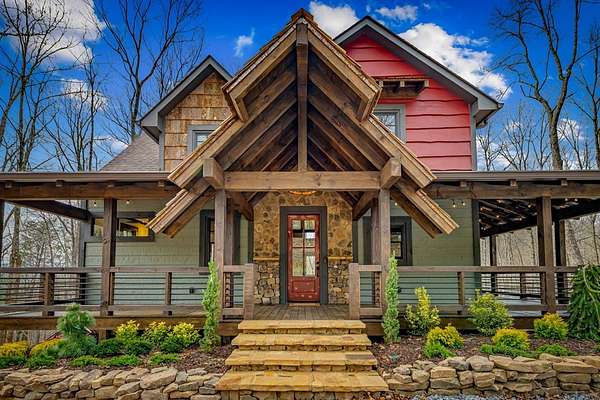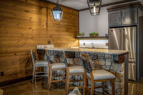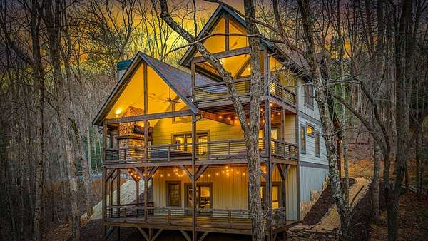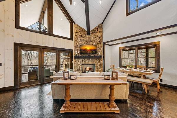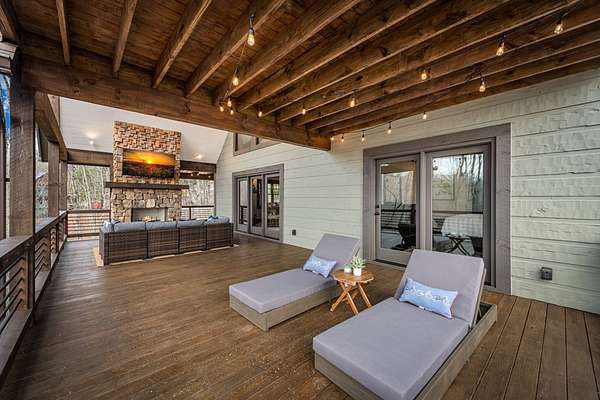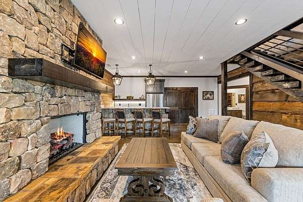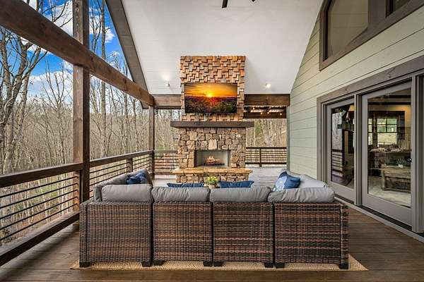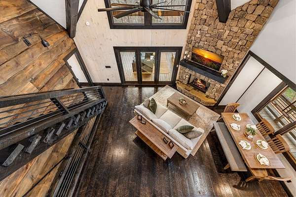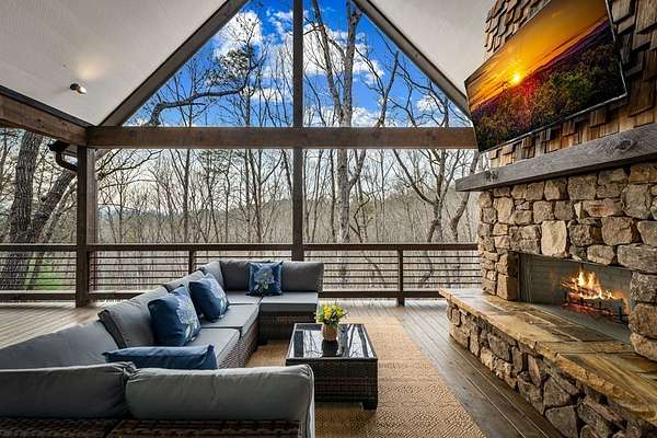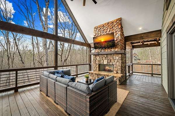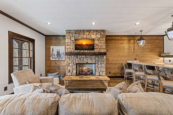 Discover the latest masterpiece by Nicholson Home Builders—a newly completed mountain retreat designed for both elevated living and exceptional rental performance. Thoughtfully crafted with a seamless blend of rustic textures and modern finishes, this home delivers a warm, high-end experience from the moment you step inside. The inviting great room is anchored by a dramatic floor-to-ceiling stone gas log fireplace, creating the perfect gathering space with an open, flowing layout. The chef's kitchen is equally impressive, featuring granite countertops, Viking appliances, stone accents, and an oversized island ideal for entertaining. A dedicated dining area provides ample space for hosting family and guests. Outdoor living takes center stage with a spacious covered porch designed for year-round enjoyment—complete with a wood-burning fireplace, TV, and dining area, making it an ideal extension of the living space. The primary suite on the main level offers a private retreat with a beautifully appointed ensuite bath with tile shower, and a generous walk-in closet. A half bath and well-designed laundry room complete the main floor. Upstairs, a versatile loft/bunk area provides additional sleeping space or flex use, along with a private ensuite bedroom featuring quality finishes throughout. The finished terrace level is built for entertaining, offering a second living area with another stone fireplace, a wet bar with full-size refrigerator and island, plus an additional bedroom and full bath—perfect for guests or maximizing rental occupancy. Offered fully furnished and turnkey, this home is ready for immediate enjoyment or income production. Located in a short-term rental-friendly community, it presents an outstanding opportunity for those seeking a refined mountain getaway with strong investment potential.