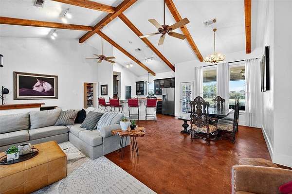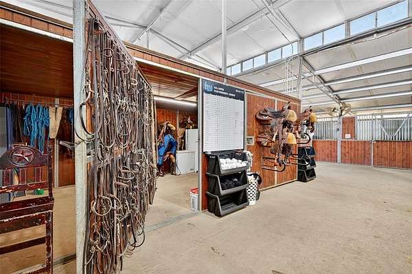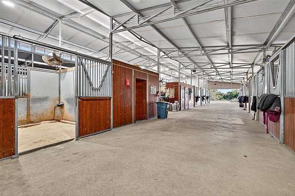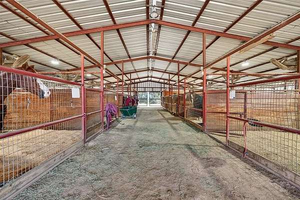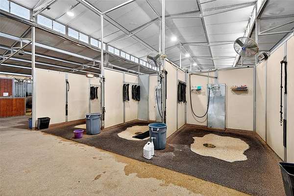 42 Stalls of Luxury: An impressive, insulated show barn with 12'x12' stalls fully equipped with mounted fans, automatic waters, and corner feeders. 5 wash racks ensure rapid, high-volume care. The barn features modern LED lighting and two restrooms, one with a washer and dryer hookup. A dedicated, rustic-chic Entertainment Lounge. Two large 12'x24' tack rooms. 125' x 250' indoor arena with high-quality LED lighting. A 12 or 24-stall Mare Motel or Overflow Barn. A 60-foot covered round pen and a large 120' x 260' outdoor riding track are ready for any discipline. The grounds features pipe-fenced turnout pastures with shelters. Two large 30' x 60' three-bay buildings provide essential hay and equipment storage.