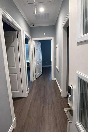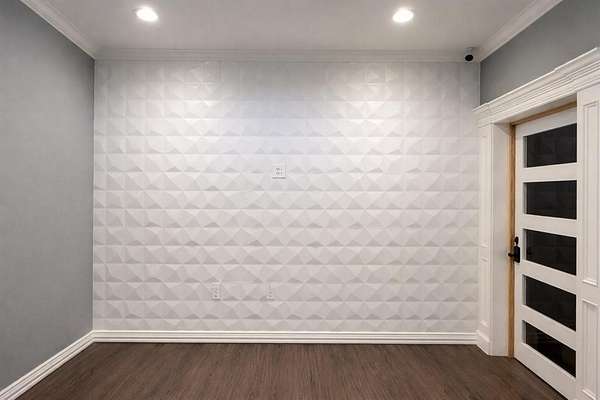 Glass frosted doors and hallway doors enhance the contemporary aesthetic while maintaining functionality and openness. The space boasts 9-foot and 11-foot raised ceilings accented with crown molding, creating a bright and spacious environment.