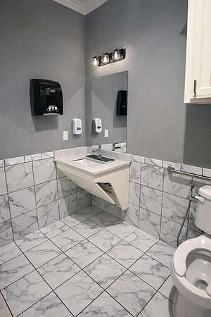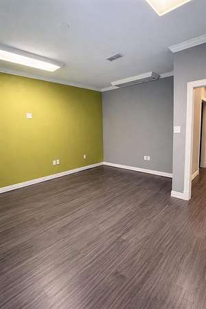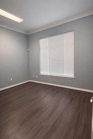 Wood-look luxury vinyl plank flooring runs throughout the suite, complemented by tile flooring in the ADA-compliant unisex restroom. The suite offers abundant natural light through large windows fitted with 2-inch blinds.