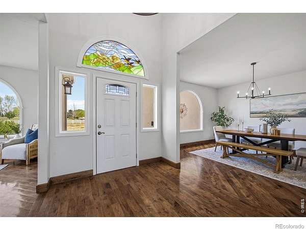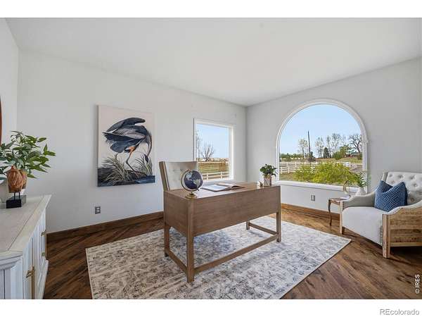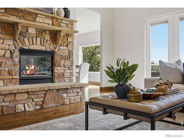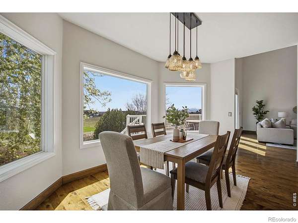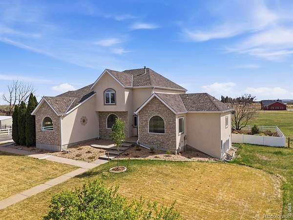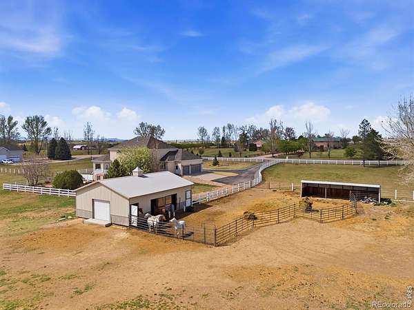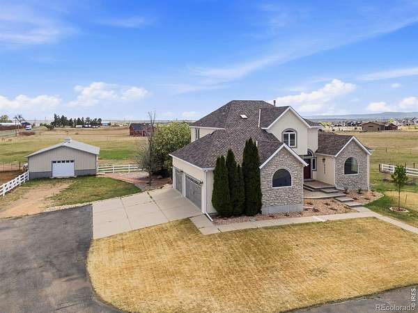 Welcome to 8952 Gander Valley Lane, where modern updates meet tranquil country living. This beautifully renovated estate features refreshed landscaping, new paint, carpet, light fixtures, renovated bathrooms, and a stunning kitchen, all tied together by gorgeous wood floors. Set on 6 private acres, you'll enjoy breathtaking mountain views and endless outdoor possibilities.The heart of the home is the gourmet kitchen, perfect for culinary adventures, paired with a formal dining room and a dramatic great room featuring a stone fireplace-ideal for cozy evenings. Relax and enjoy the mountain views from your main-floor primary suite, featuring a renovated 5-piece luxury bath. Outdoor enthusiasts will love the expansive grounds, complete with a natural gas fire pit, a tranquil pond with a waterfall, and plenty of space to roam, play, or unwind. For equestrians or hobbyists, the 30x40 barn with four portable stalls and fenced pasture offers endless possibilities for horses, a workshop, or even a cherished car collection. A loafing shed and additional parking ensure there's room for all your toys and tools.Looking for even more space? The partially finished garden-level basement, with its fourth bedroom and abundant natural light, offers endless potential to customize.Minutes from Windsor, Fort Collins, and Harmony Club golf course, this is your chance to embrace modern style, outdoor adventure, and peaceful living.