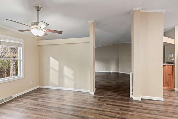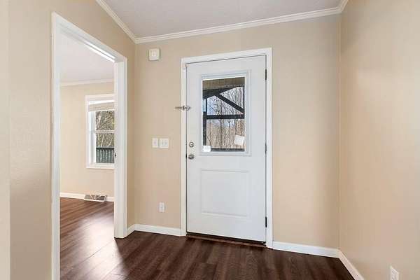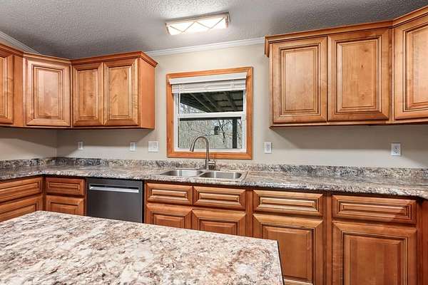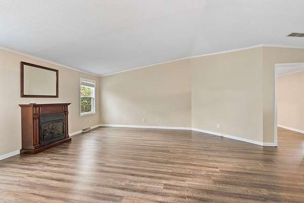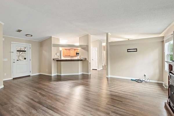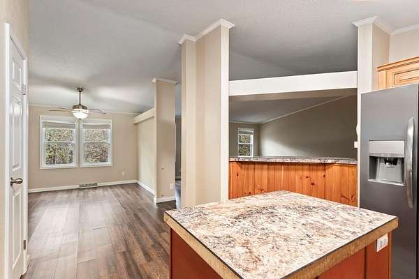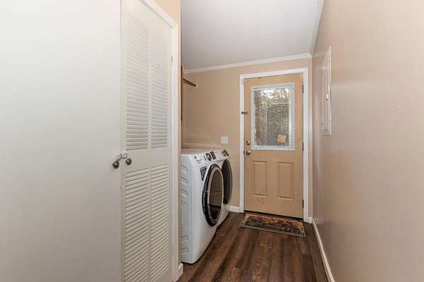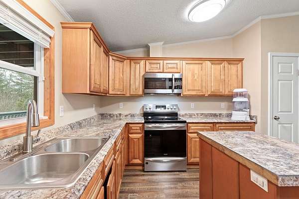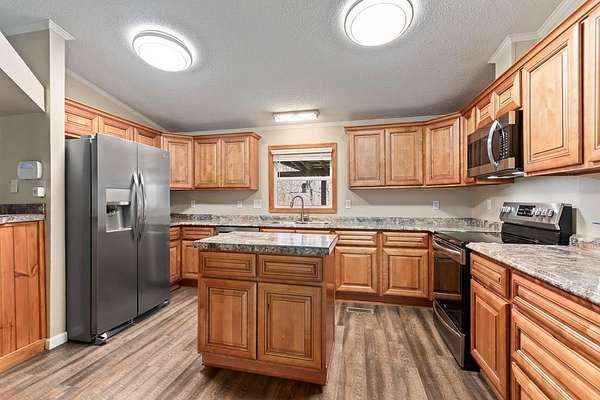 Tucked away on nearly five private, wooded acres, this 3-bedroom, 2-bathroom manufactured home offers peaceful living with no close neighbors and room to truly breathe. A long, tree-lined driveway welcomes you in, opening to generous parking and a quiet setting surrounded by nature. Step onto the full-length front porch, then inside to a bright, spacious living room with a vaulted ceiling, luxury vinyl flooring that runs throughout the home, and a cozy gas log fireplace that anchors the space. Just off the living room, the thoughtfully separated Master Suite provides privacy and comfort. It features a large walk-in closet and an en suite bathroom with dual sinks, a medicine cabinet, a relaxing jetted garden tub, and a separate step-in shower. The kitchen is designed for both everyday living and entertaining, offering abundant cabinets and counter space, stainless steel appliances, a pantry, and a center island. A dedicated dining area sits adjacent, creating an easy flow for meals and gatherings. Down the hall, you'll find two guest bedrooms with vaulted ceilings and walk-in closets, a full guest bathroom, and a laundry room with built-in cabinets and convenient access to the back deck. Outside, enjoy evenings around the fire pit, extra storage in the shed, and the serenity of your wooded acreage. Fiber Optic internet keeps you connected, and an inactive security system is already in place. Private, comfortable, and move-in ready--this home blends modern convenience with a peaceful country setting.