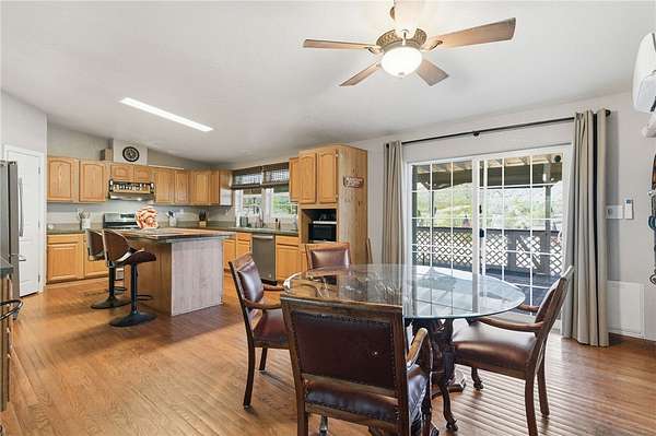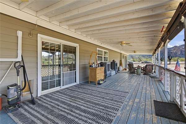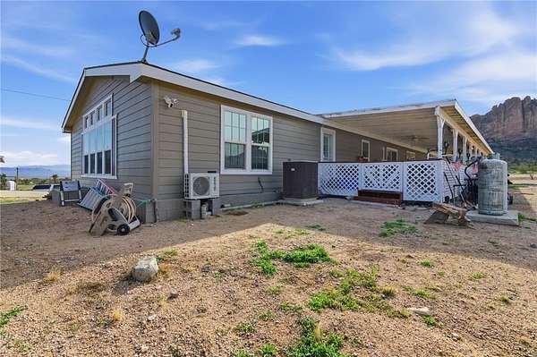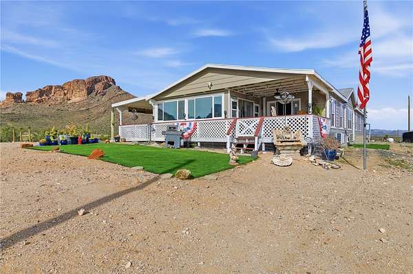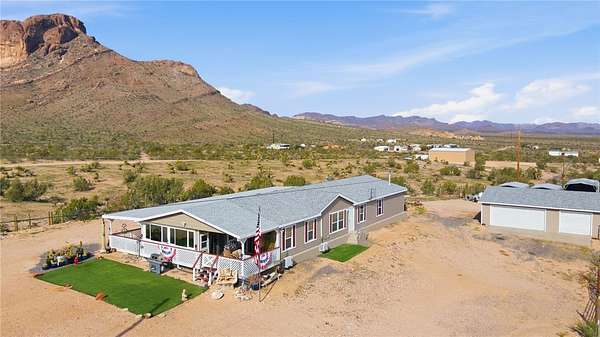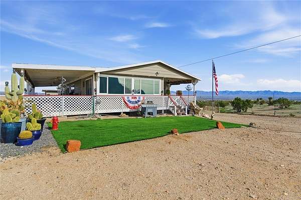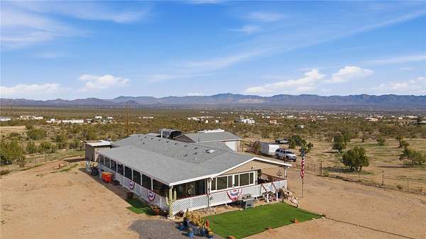 Stunning Southwest Foothills Retreat with Panoramic Views! Set in the highly sought-after Southwest foothills of Golden Valley, this exceptional property offers breathtaking, million-dollar panoramic mountain views and sparkling valley lights at night. Situated on 4.41 acres with its OWN PRIVATE WELL, this 3BR, 2BA, DW MH spans 2,309 sq. ft. and delivers privacy, space, and unforgettable scenery. An expansive wraparound porch invites you to take full advantage of the outdoor lifestyle perfect for entertaining, dining alfresco, or simply relaxing. An enclosed Arizona room, seamlessly incorporated into the porch, provides a cozy retreat on cooler days. Inside, the spacious split-floorplan is filled with natural light, enhanced by ceramic-tinted windows to frame the stunning views. Vaulted ceilings add to the open feel, while an arched entry leads from the living room into a versatile office or den. The large country kitchen features a central island with breakfast bar, built-in desk, pantry, and abundant cabinet and counter space. A casual dining area includes a built-in display cabinet, and a sliding glass door offers easy access to the porch. The generous primary suite includes direct access to the porch and Arizona room, a spacious closet in the bedroom, and an additional walk-in closet in the primary bathroom. The ensuite bath features double sinks and shower. An extra-wide hallway leads to two guest bedrooms, a full guest bathroom, and a utility room. Through French doors, the inviting family room showcases large windows, a gas fireplace, and a built-in TV area ideal for relaxing or gathering with family and friends. In addition to central heating and air, the home is equipped with four mini-split systems for enhanced energy efficiency. Exterior amenities include a detached 3-car garage, a 12x24 RV carport, two additional three-sided carports, and RV hookups. Outdoor enthusiasts will appreciate the close proximity to the Mount Nutt Wilderness Area, offering hiking, rock climbing, biking, horseback riding, off-roading, and abundant wildlife viewing. This is a rare opportunity to own a private desert retreat with incredible views, extensive amenities, and unmatched access to nature. Come and explore our beautiful Arizona desert, beautiful sunrises, sunsets and starry night skies. Don't wait call a Realtor and schedule your personal tour today.
