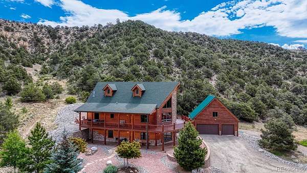 Exceptional Mountain Retreat. This custom-built luxurious log home delivers an unmatched blend of timeless craftsmanship, elegant finishes, and awe-inspiring 360-degree mountain views including the towering 14,228 ft Mount Shavano. Designed for both comfort and grandeur, the home features stunning tile and hardwood floors, rich knotty alder trim and bath cabinetry, custom cherry kitchen cabinetry, and artfully crafted beetle-kill pine stairs. The gourmet kitchen is a chef's dream with dual ovens, walk-in pantry, and thoughtful finishes throughout. Enjoy serene mountain mornings or cozy evenings in front of one of three fireplaces, or unwind outside around the custom-built stone gas fire pit. Large windows, wrap-around deck, and open-air design are all thoughtfully planned to frame spectacular views by day and starlit skies by night. Generous primary suite offers a spacious walk-in closet and ensuite bath. A loft with breathtaking views provides the perfect perch for reading. The fully finished walkout level with large windows is an entertainer's haven, complete with a bar, rec room, surround sound, office, bedroom, full bath, and a laundry room. The bonus room over the garage invites possibilities for an art studio, gym, storage or workshop. Surrounded by public BLM land and bordered by majestic rock formations, this home offers rare privacy and direct access to Colorado's natural wonders, including National Forest trails and the nearby Colorado Trail, a multi-story waterfall, and the soothing sounds of the North Fork of the Arkansas River on summer evenings. Professionally landscaped, decorative rock features, meticulously maintained, smoke and pet-free, and boasting a highly efficient home is move-in ready. Close to Monarch Mountain ski resort and the vibrant town of Salida, renowned for its outdoor recreation, artistic spirit, and welcoming community. This is Colorado mountain living at its finest,refined, peaceful, and surrounded by beauty. Shown by Appointment.
