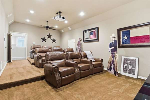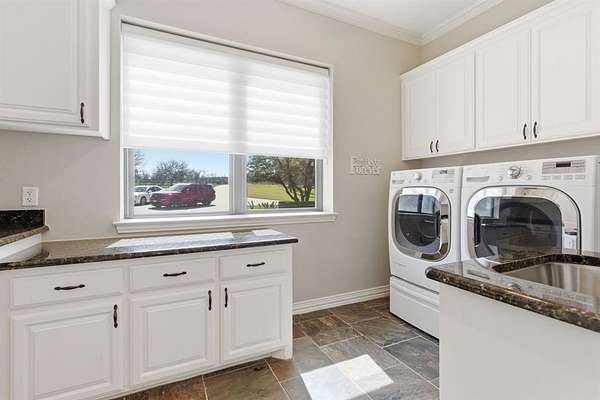 Experience elevated country living in this stunning luxury retreat in Justin, TX, set on 42 expansive acres. This steel-framed and concrete-built home showcases modern elegance with a sleek metal roof and exceptional craftsmanship throughout. Inside, comfort meets sophistication with heated floors in the primary bathroom and a chef’s dream kitchen featuring commercial-grade Dacor appliances. Custom lighting enhances every space, while a butler’s pantry and dry bar add both convenience and style. Designed for both everyday living and entertaining, the home offers a spacious bonus room, media room, and abundant storage. Step outside to take in breathtaking views from the large covered patio, or host gatherings in the fully equipped outdoor kitchen. Enjoy resort-style amenities including a sparkling pool and a private basketball court. Built with efficiency and sustainability in mind, this property features insulated ductwork, a whole-home generator, water well system, propane gas, three energy-efficient AC units, and a tankless water heater—delivering comfort, reliability, and peace of mind.