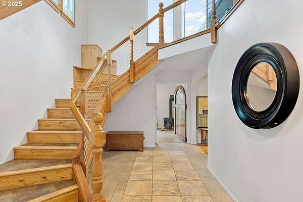Damascus farmhouse on 5 private acres with a million dollar Mt. Hood view. Arrive in style under the lighted carriage porch and step through custom arched metal doors into a grand foyer with a sweeping staircase. The main-level primary suite opens to a wraparound deck, while the spacious open floor plan offers a large kitchen and stylish design elements throughout. A main level mudroom with laundry and separate entrance adds convenience. Upstairs lives like its own 2-bedroom suite with kitchenette-ideal for guests or rental income. Detached studio ADU, an oversized 2-car garage plus ample parking. The property features raised garden beds, an orchard with fruit & nut trees, a pond, gazebo, paddock with newer wire fencing, and a barn with multiple stalls on lower level and storage for equipment or toys on the upper. Pasture is sloped, but would work well for a variety of farm animals.
