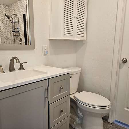 - Double Vanity, Linen Closet, Open Floorplan, Primary Downstairs, Shower/Tub Combo, Smart Thermostat, Solid Surface Counters, Tile Counters, Tile Shower, Vaulted Ceiling(s), Walk-In Closet(s)