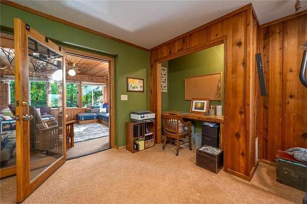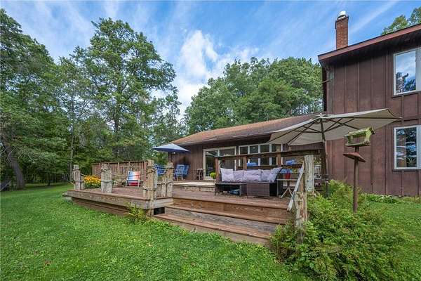 Nearly 3,000 sq. ft. home on 4+ wooded acres with 437' of frontage on the Apple River Flowage! This 4-bedroom, 4-bath retreat offers a peaceful paradise surrounded by wildlife. The open-concept floor plan flows seamlessly to a spacious, multi-level deck spanning over 1,000 sq. ft., along with an inviting enclosed porch--perfect spots to relax and take in the scenery. The Apple River Flowage is a 4-mile stretch known for excellent fishing and an amazing nearby swimming hole, making it a true recreational gem. Inside, the fireplace adds warmth and ambiance to your dining experience. The lower level offers tremendous potential for expansion, with plumbing roughed in for 2 additional bathrooms. Once finished, the basement could nearly double the home's square footage, adding even more value and versatility including great potential for a vacation rental. Just minutes north of Amery, this property combines comfort, privacy, and natural beauty in one stunning package.