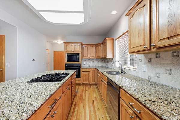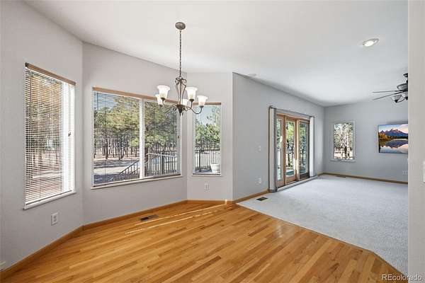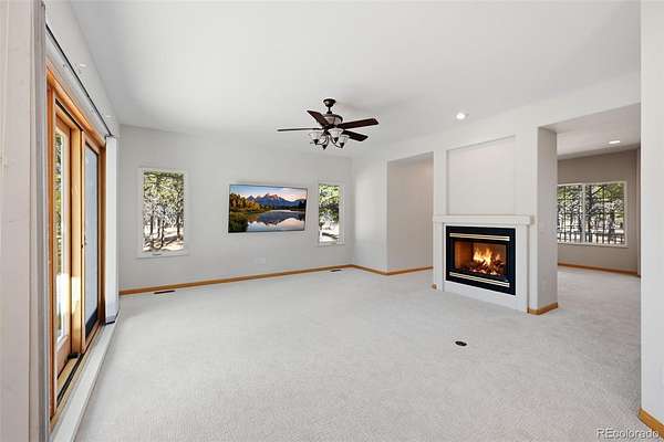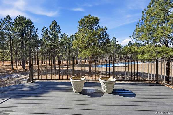 Enjoy the quiet, peaceful environment of this Colorado retreat on five beautifully treed acres,. The residence features a recent interior refresh with new paint and carpet throughout. The kitchen serves as a functional center with walnut cabinetry, granite surfaces and a custom travertine backsplash. Integrated features include a large walk-in pantry, gas cooktop and roll-out shelving. The formal dining room displays hand-troweled walls and a coffered ceiling, while a two-sided gas fireplace connects the formal living and family rooms. The primary suite includes a dedicated sitting area, new flooring and a private deck. Practicality defines the entry from the oversized, insulated garage, which leads to a mudroom and laundry area equipped with a custom dog wash. The lower level provides a secondary family room with a wood-burning stove. A theater room features surround sound and a secondary kitchenette with a full refrigerator. Top off your tour of the pristine beauty of this large property which has a fenced dog run and separate fenced area for horses by checking out the views of Pikes Peak from the granite bluffs at the back of the lot. Schedule your showing today!