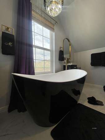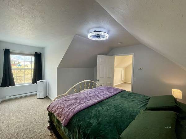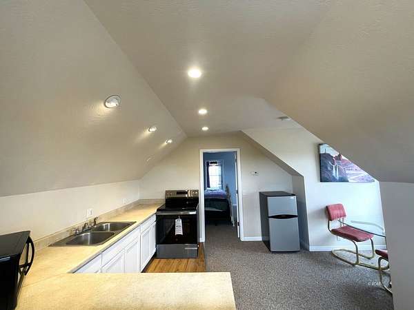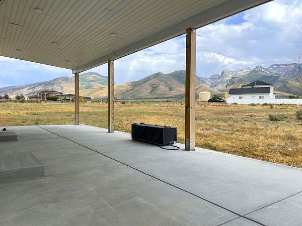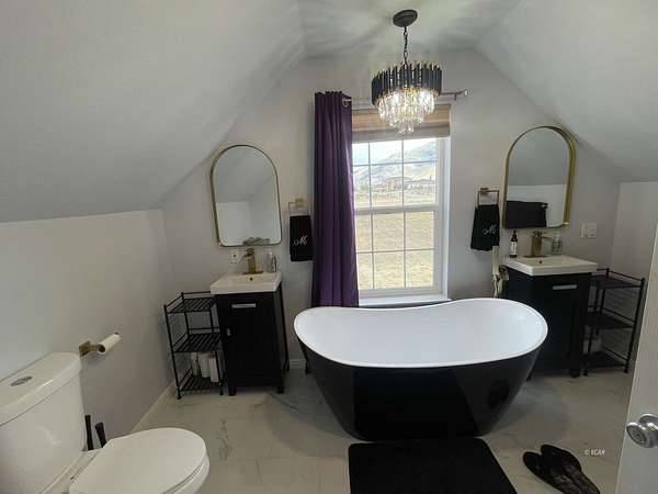 This one-of-a-kind space features a charming dining nook, a convenient kitchenette, a beautifully remodeled full bathroom, and a spacious master bedroom. Thoughtful storage is integrated throughout, making it as practical as it is inviting. The main level is currently set up as a cozy living room with a durable epoxy floor and includes a laundry area, utility room creating a functional and flexible layout. The garage doors are still in place, offering the option to easily convert the space back into a traditional garage if desired. Step out the back sliding doors to a covered patio with breathtaking views of the majestic Ruby Mountains-perfect for relaxing after a day outdoors. Additional highlights include radiant and baseboard heating upstairs, a stove flue and radiant heat in the garage, and ample space for RV parking. Whether you're looking for a full-time residence, weekend retreat, or investment opportunity, this property offers versatility, comfort, and stunning scenery.