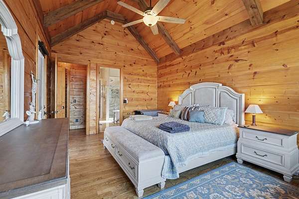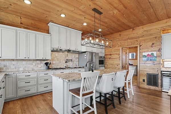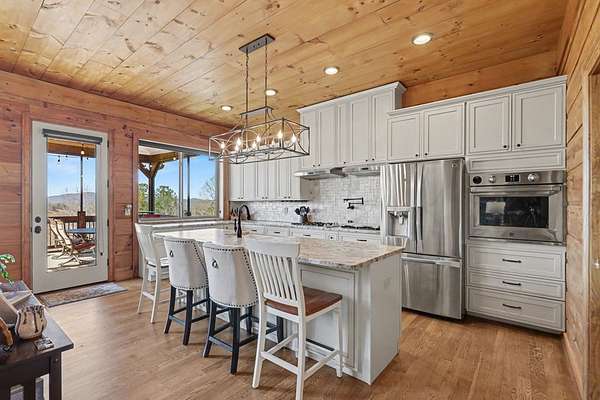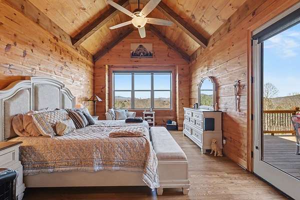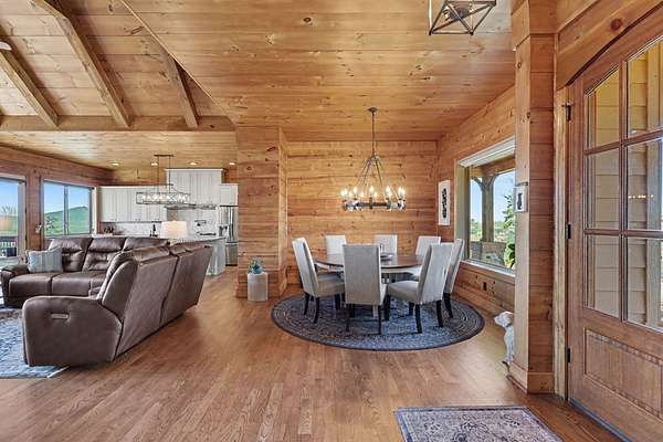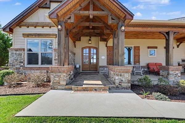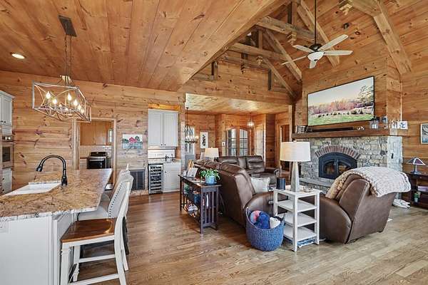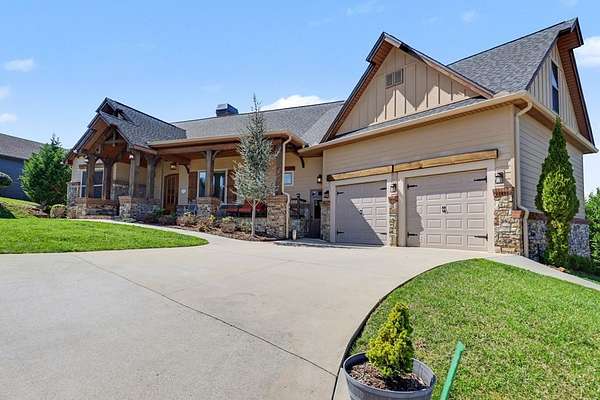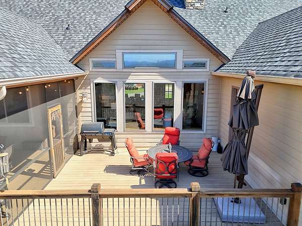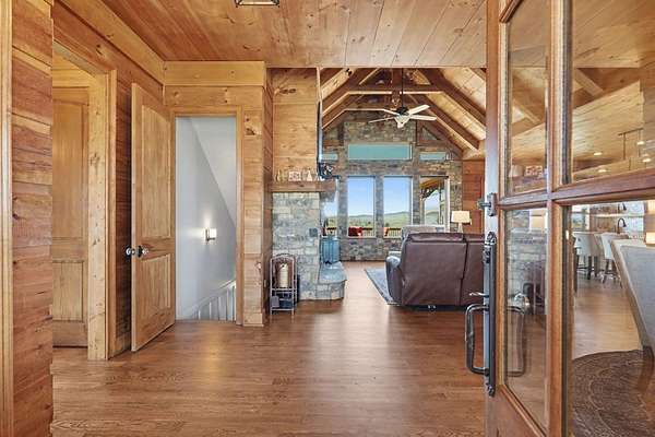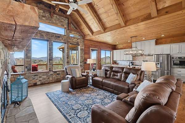 Located in the highly sought after Thirteen Hundred community, this stunning craftsman-style home with breathtaking, long-range mtn views from every room. Perfectly positioned on 1.76 acres, the property offers an incredible setting with panoramic views and lake access! Main level features vaulted wood ceilings, rich wood floors and walls, and striking natural stone accents throughout. Open living area is centered around a beautiful stone fireplace with a high-efficiency wood-burning insert designed to help heat the whole home. The space flows seamlessly into the kitchen, complete with an 8-burner gas cooktop, stainless steel appliances, a wet-bar and custom architectural details including interior and exterior truss beam work, lintels, and corbels. You'll find the spacious primary suite with remodeled bathroom and a large office. Upstairs features an additional bedroom, a half bath, and abundant storage space. The terrace level offers additional living space, two generously sized bedrooms, including a second primary suite, a second full kitchen with recent updates and flexible space for recreation making it ideal for guests! One room has been outfitted with rubber flooring, creating the perfect space for a home gym. Oversized 2 car garage and workspace. Recent enhancements include a polyurea-coated garage and lower patio, a whole-house Generac generator w/ auto switch, EV charging station in the garage, and extensive tree clearing with the property already seeded to maximize and enhance the mountain views. Other improvements are a new roof (2024), refinished main level flooring, new flooring and carpet on the terrace level, fresh interior paint, updated countertops, sink, faucet, and refrigerator in the lower kitchen, upgraded lighting, improved central vac system, and septic risers installed. Amenities include Lake Access, a community pool, outdoor lodge with mountain and lake views! This home truly has it all—Views, Upgrades, and an Exceptional Design!
