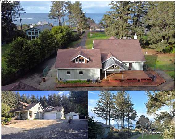 Experience the serenity of Oregon's coastline from this private OCEAN-VIEW retreat, uniquely bordered by 300 acres of protected Oregon State Park land - ensuring enduring PRIVACY and an unspoiled natural backdrop // Set on 1.51 acres, this exceptional coastal residence offers refined living just minutes from beaches, fishing and world class golf // Built in 2007, this 3-bedroom, 2.5-bath home blends timeless COASTAL architecture with warm, inviting interiors // The living room is anchored by a gas fireplace, creating an elegant yet comfortable gathering space filled with natural light // The spacious kitchen showcases GRANITE countertops, a large island open to the dining area, and a generous pantry - ideal for entertaining or everyday coastal living // The primary suite offers a private retreat featuring a soaking tub, walk-in shower, double vanity sinks, and direct access to the rear covered deck // Upstairs, a SITTING AREA positioned between the guest bedrooms captures beautiful views and provides flexible space for reading, relaxing, or a home office // Adding exceptional versatility, a private GUEST SUITE (419 sf) above the attached garage provides ideal accommodations for guests, multigenerational living, creative space, or potential income opportunity // The (1,152 sf) detached garage/SHOP is equipped with forced-air heating, built-in workbenches, and abundant storage // Step outside to enjoy expansive DECKING, mature trees for privacy, and glimpses of the Pacific // The long driveway provides ample parking for guests, boats, or recreational vehicle // Located just minutes from Sunset Bay, Shore Acres, and Bastendorff Beach, and a short drive to renowned golf courses, this property offers exceptional access to some of the coast's most treasured destinations.