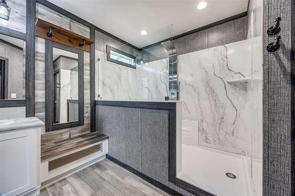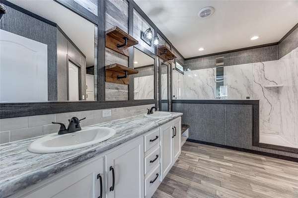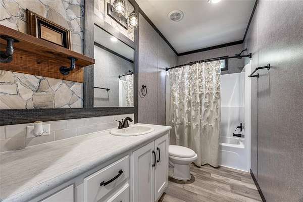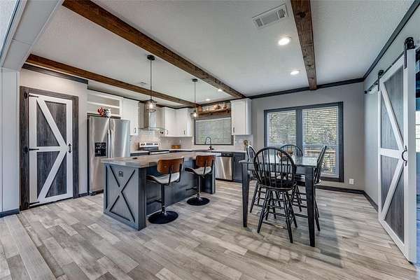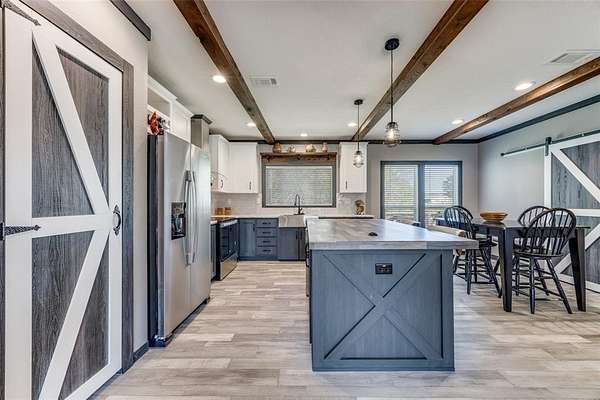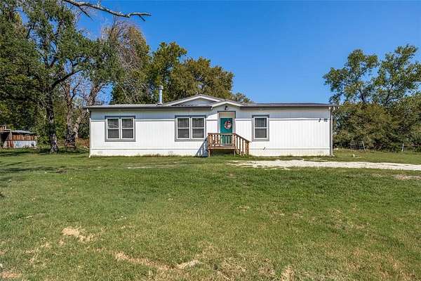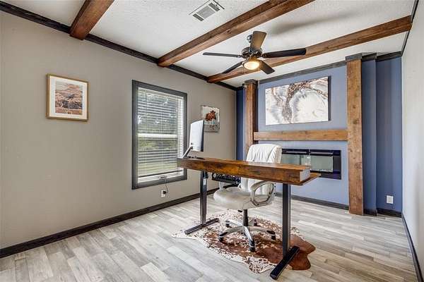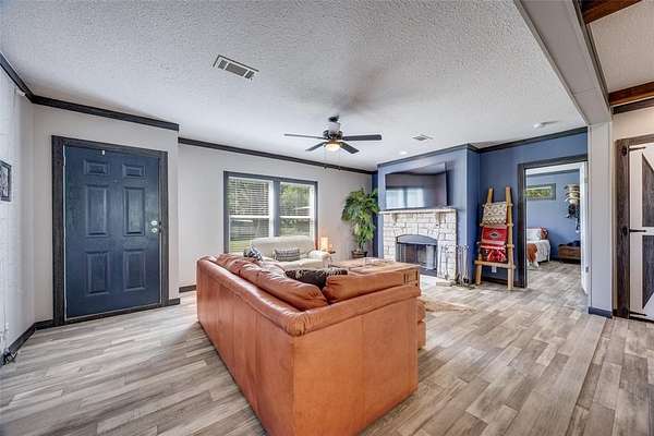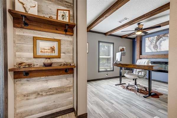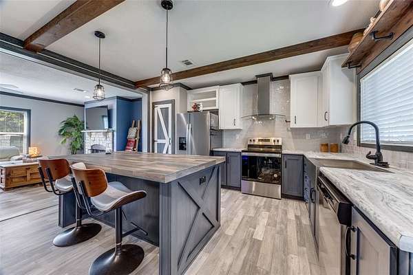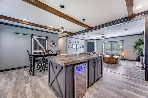 The property welcomes you with a picturesque entry and continues to impress with a stunning 2023 Palm Harbor manufactured home with permanant slab foundation. This home blends modern comfort with rustic charm. Step inside to an open-concept floorplan anchored by a cozy wood-burning fireplace, a chef's island with farmhouse sink, wine fridge, and spaces designed for entertaining. The primary suite offers a spa-like walk-in shower and generous closet space, while two additional bedrooms, a full bath, and a flexible second living area--currently used as an office--round out the thoughtful design.