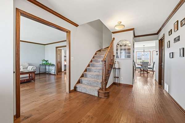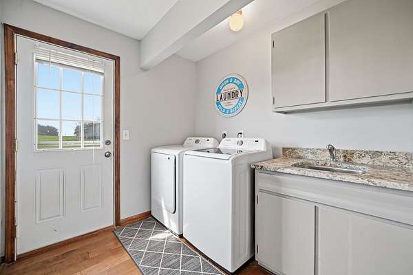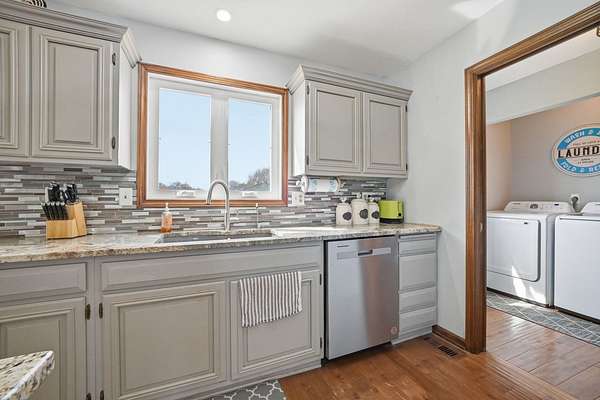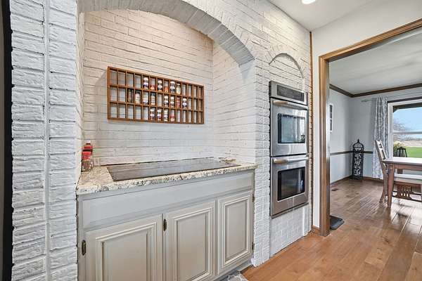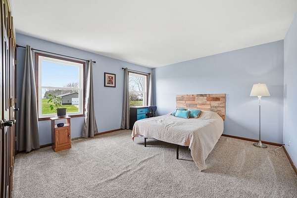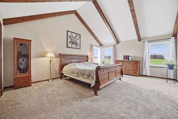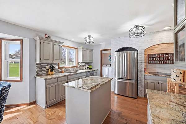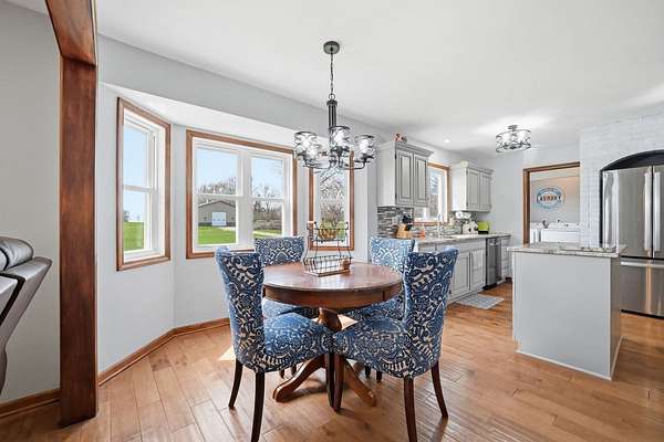 Welcome to your private retreat on 7.58 beautiful acres, where space, updates, and functionality come together seamlessly. This fully updated (2016) 5-bedroom, 3.5-bath home offers the perfect blend of modern finishes and country living. Step inside to find a thoughtfully designed layout featuring a main floor bedroom-ideal for guests, a home office, or flexible living-along with the convenience of a first-floor laundry room. The heart of the home is the beautifully updated kitchen, showcasing granite countertops, stainless steel appliances, and a center island perfect for prep and gathering. Custom details set this space apart, including a stylish tile backsplash, built-in cabinetry with glass display accents, and double ovens for effortless entertaining. The kitchen also features unique arched architectural brick details, adding character and charm, along with warm wood flooring that flows seamlessly throughout the space. Upstairs, you'll find generously sized bedrooms and a walk-in attic, providing exceptional storage or future expansion potential. Major exterior updates include new windows and siding, offering both peace of mind and enhanced curb appeal. New roof 2023. The home also features a 2.5-car attached garage for everyday convenience. For those needing additional space or functionality, the property truly shines with a 48x64 Zenz-built garage, featuring 7-inch concrete floors, drains and electric, and rough-in for future bathroom, perfect for hobbies, storage, business use, or recreational equipment. Additional outbuildings include two sheds. 3 apple trees located on property. Home is serviced by electric for heating. If you've been searching for acreage, updates, and space to live, work, and play-this is the one.