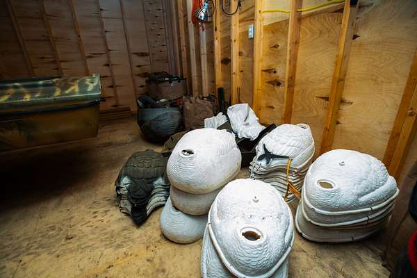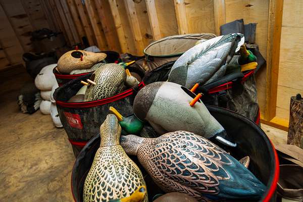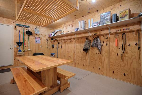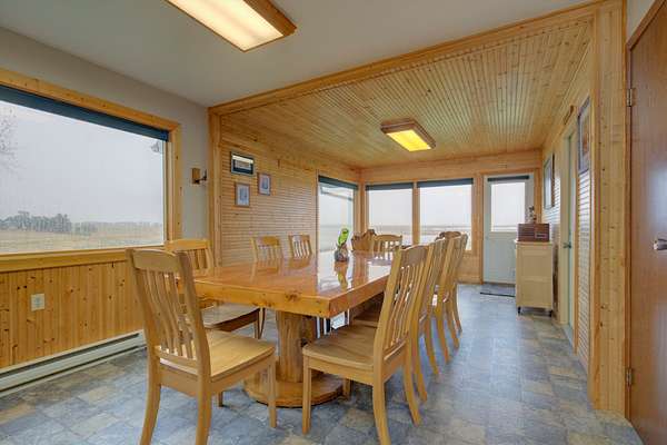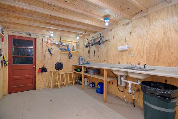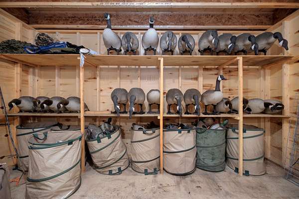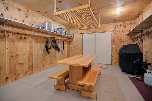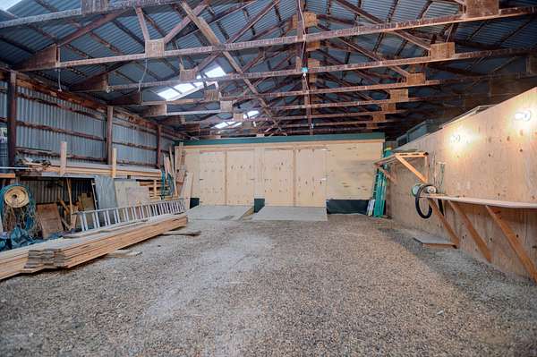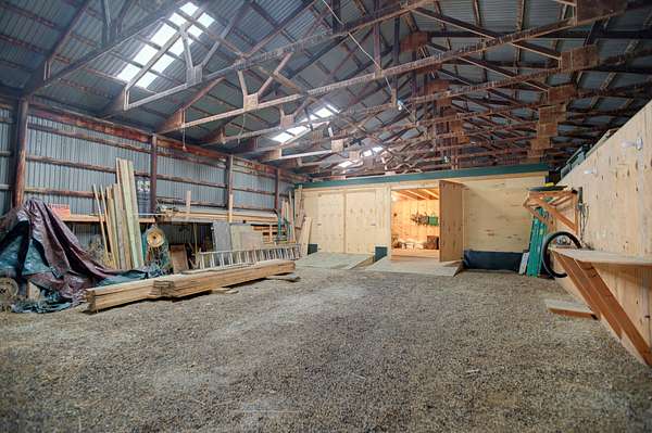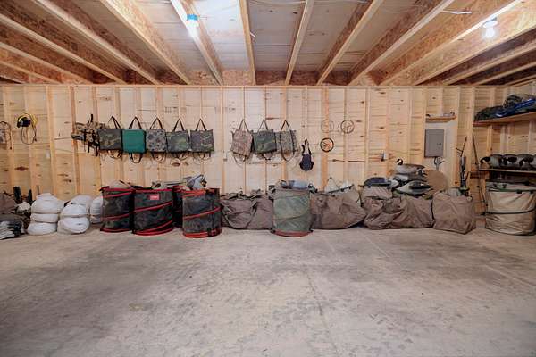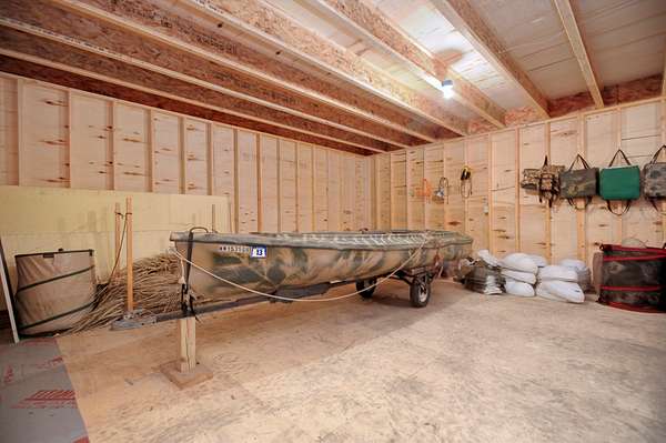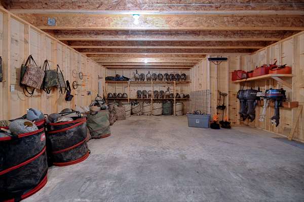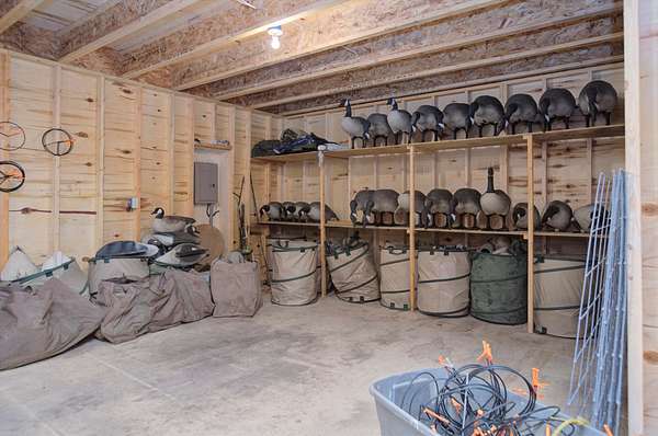 The storage building is steel frame and roof truss construction with sheet metal siding/roofing measured at 40? x 56? dimensions. The building has double sliding doors that provides a 18? foot opening for easy access and plenty of parking space for pickup trucks and oversized vehicles. There is a separate access to the 150 SF shop room which includes tools, equipment and supplies. Much of the remainder of the building is being currently used for the storage of decoys, blinds, outboard motors and related miscellaneous equipment and accessories.