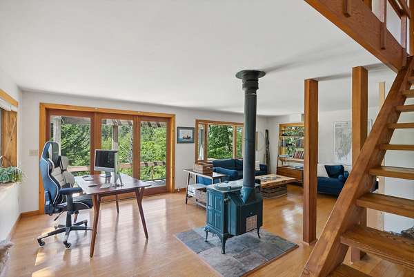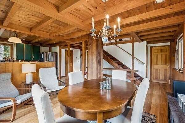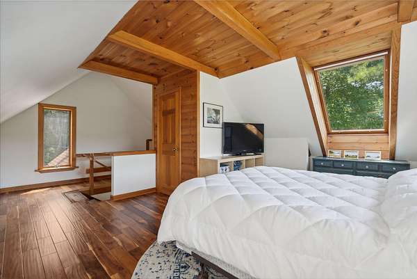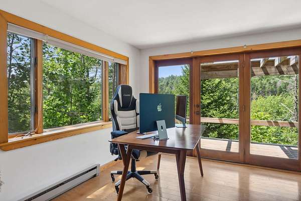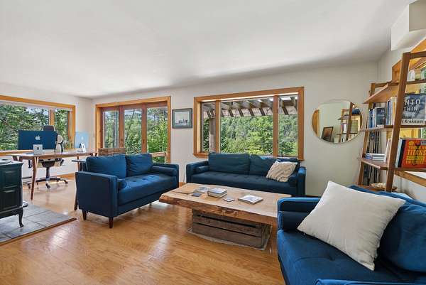 This unique property epitomizes a quintessential Maine escape, offering breathtaking 100-foot cliff views of Long Reach Cove from Hogback Ridge. Upon entering and ascending the winding driveway, you will experience a perfect blend of seclusion and convenience, with the desired privacy of Great Island just minutes from Brunswick. The first dwelling on your right, Cove Cottage, spans 1,500 square feet and was crafted by local Master Craftsman Ken Wille. Constructed from White Oak ,he personally milled, in New Hampshire, this three-story cottage features expansive views of Long Reach Cove and the Cliff Trail Ridge, surrounded by a variety of Maine hardwoods. Its wrap-around decks and floor-to-ceiling windows seamlessly integrate the natural Maine landscape with the interior. Jotul stove is the place to enjoy the warm embrace of the home. The second dwelling, the Rustic Craftsman's Studio, encompasses 1,000 square feet. The frame was built by renowned local craftsman builder, John Libby. Currently utilized by a local artisan, this space holds potential for transformation into a second two-bedroom home with some creative vision. The studio has been heavily insulated. The property includes two access points to the private beach. The trail from the cottage offers a direct but steeper descent, while the more accessible route is via the second trail across from Stephen's Road. The beach is ideal for launching kayaks and enjoying spectacular sunsets, frequently accompanied by sightings of Great Blue Herons, Snowy Egrets, various ducks, Eagles and Osprey. Both homes feature original fixtures with numerous updates, including refinished hardwood floors throughout all 3 floors, a new roof, powered utility sheds, and German-engineered hillside potential garden. A three-acre state-owned buffer adds to the property's seclusion, providing an extra layer of privacy. This protected land ensures a tranquil environment, enhancing the serene and secluded atmosphere of your Maine Escape.