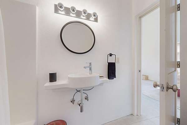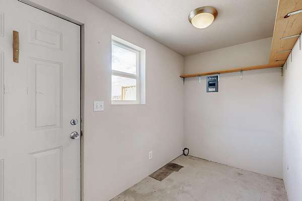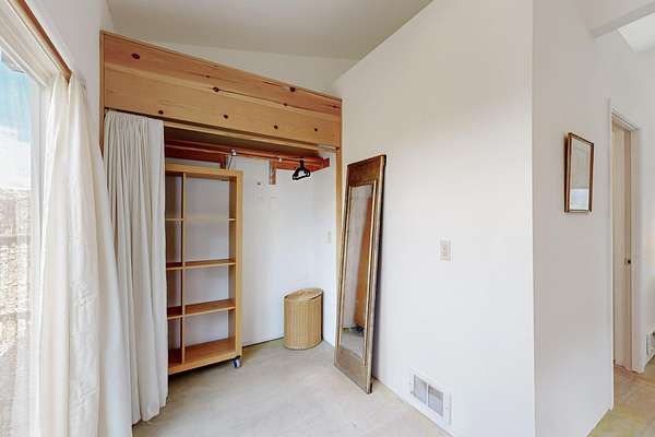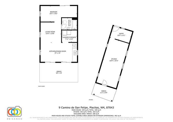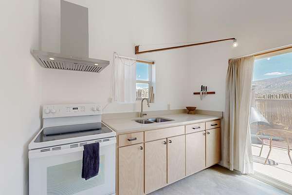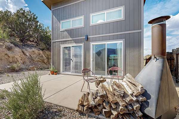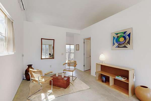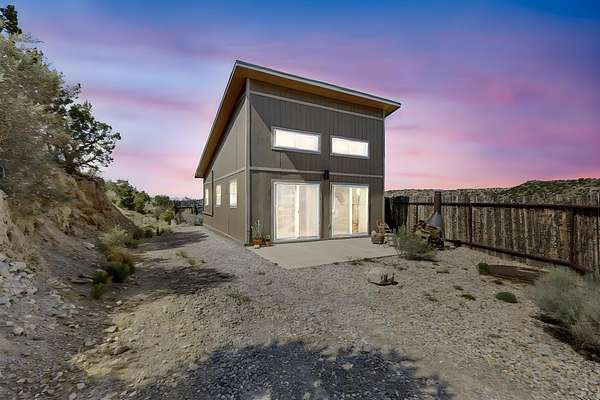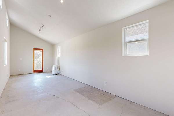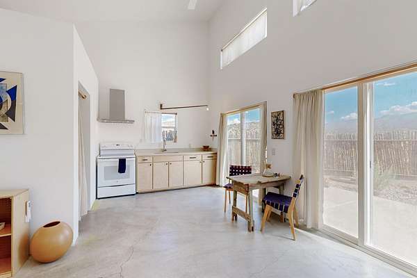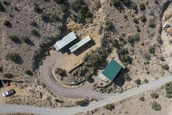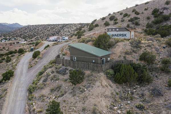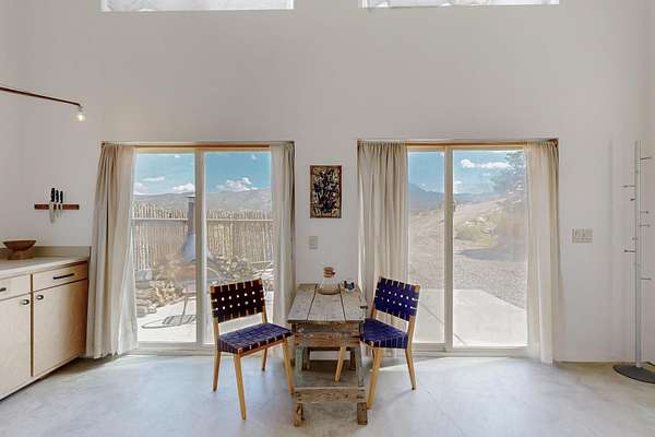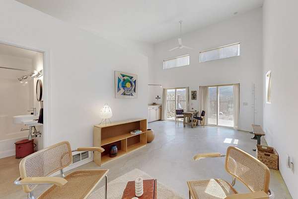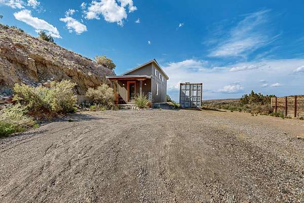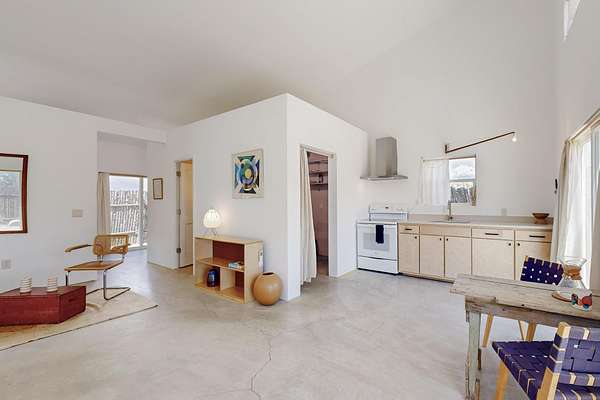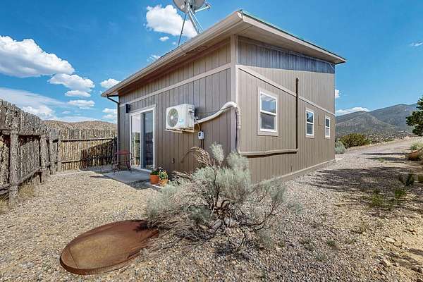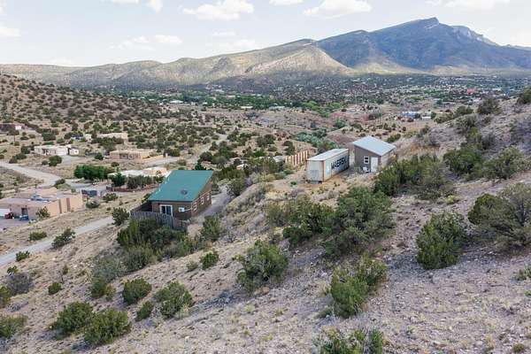 Nestled in the serene foothills of Placitas, this charming 1-bed, 1-bath home offers a tranquil retreat on 1.66 acres. The home encompasses 597 sq ft of thoughtfully designed living space, complemented by a 364 sq ft detached studio/office. The open-concept layout features soaring 9' to 16' ceilings with clerestory windows to provide abundant natural light. Concrete floors and a metal roof ensure durability and low maintenance. Ideal for artists or those seeking a minimalist lifestyle, the property boasts stunning southern exposure and panoramic mountain views. The studio is equipped with heating and cooling and offers potential for expansion. This unique property is located 1/3 mile off a paved road with minimal covenants, privacy, modern design, and natural beauty!