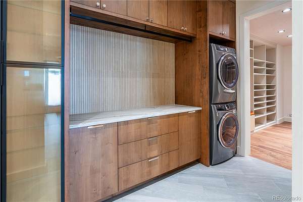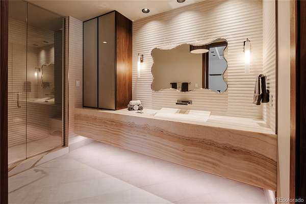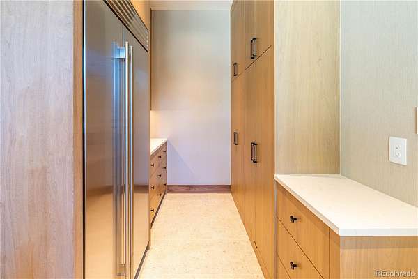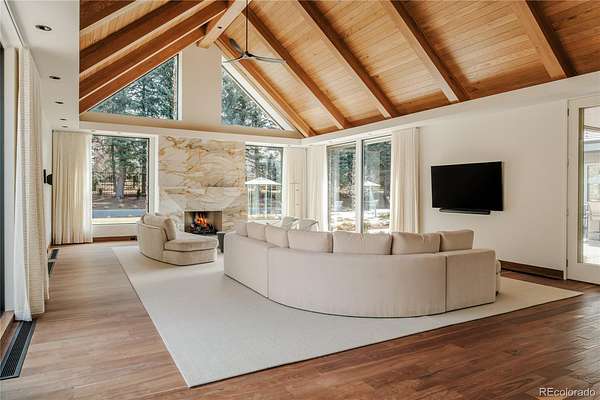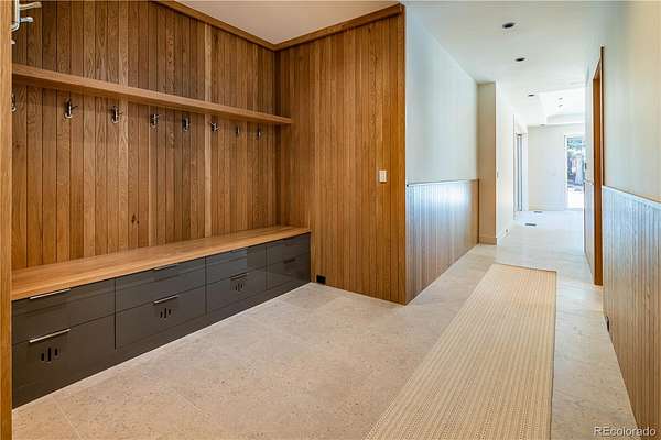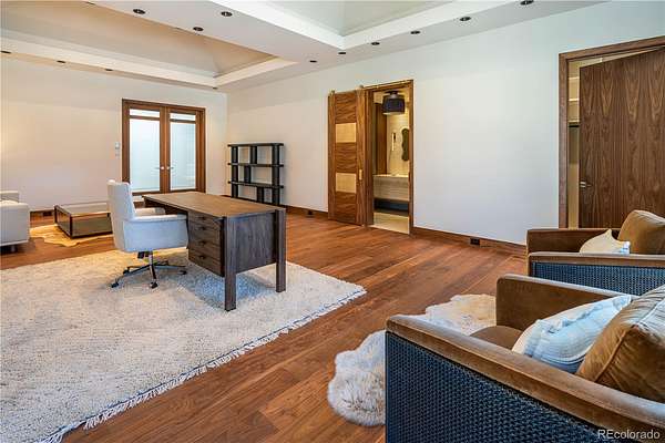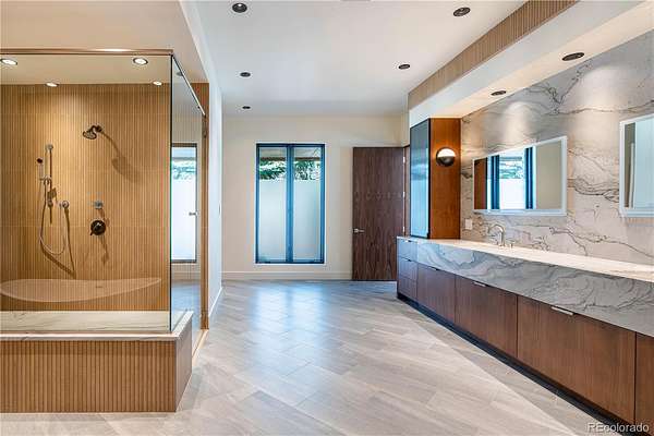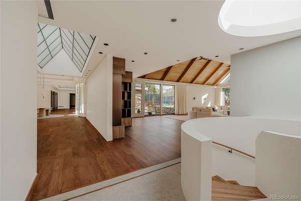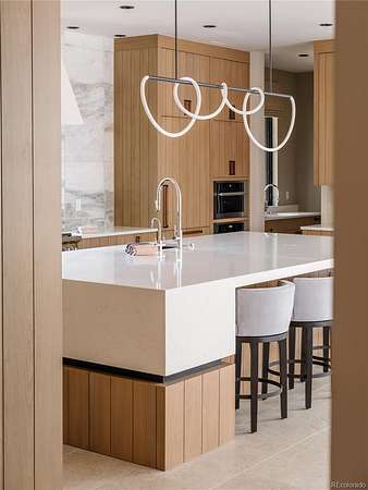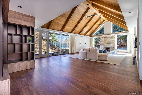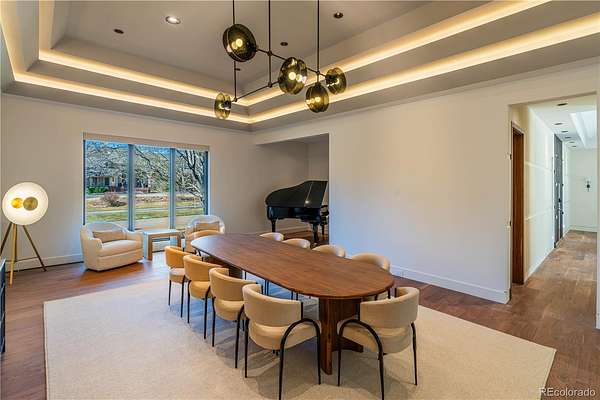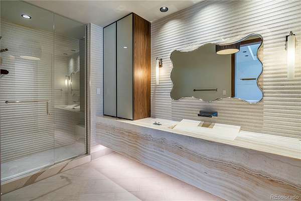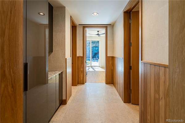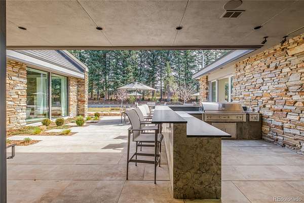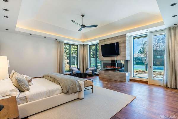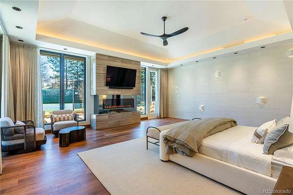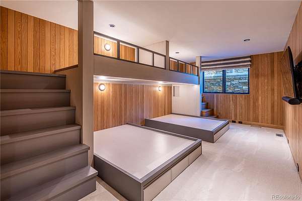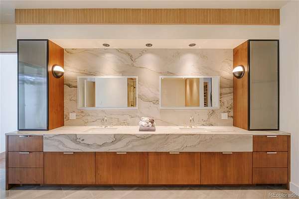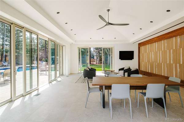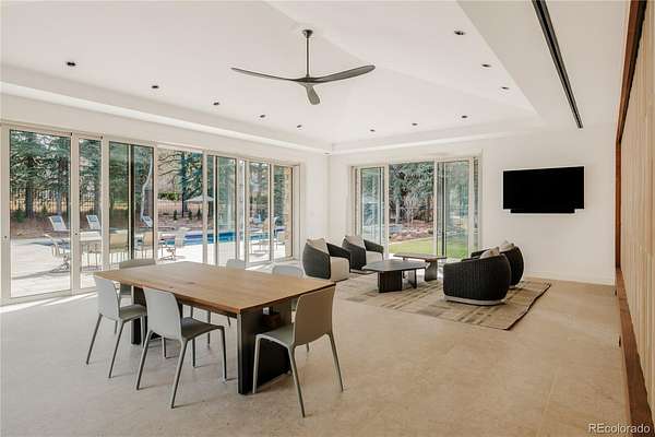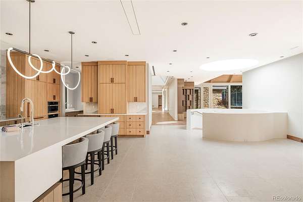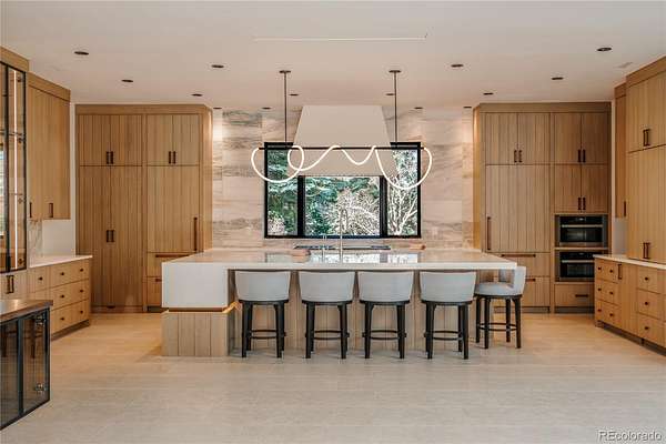 Set within the prestigious Cherry Hills Farm community, 9 Cherry Hills Farm Court—The Linear House—has been completely reimagined through a full-scale, design-forward renovation led by Duet Design Group. Offering 8 bedrooms and 10 bathrooms, including a private mother-in-law suite, the home honors its original modern architecture while introducing a refined, tonal-minimalist palette blending contemporary and transitional design into a cohesive living experience. A dedicated bedroom wing hosts 4 bedrooms, anchored by a serene primary suite featuring a spa-inspired bath with dual quartzite vanities, in-room laundry, separate his-and-hers closets, and an abstract concrete feature wall. The chef’s kitchen is both functional and sculptural, appointed with limestone flooring, quartzite countertops, marble backsplash, top-of-the-line appliances, and a butler’s pantry. Adjacent living and dining spaces are designed for both daily living and elevated entertaining. The main level also offers a private gym and a versatile lounge with fully retractable sliding doors opening to the backyard—creating a seamless indoor-outdoor experience. The lower level includes a rec room with reinforced ceiling support for a climbing wall or training equipment, a wine cellar, and guest accommodations, including a bunk room with four built-in beds. Outdoors, the grounds feature mature landscaping, an in-ground pool, tennis court, built-in grill with bar seating, circular drive, and a gated, oversized three-car garage. State-of-the-art technology includes a whole-home Sonos system, Flowlogic leak detection with remote shutoff, automated shades, and a Ubiquiti camera system with nine exterior cameras and AI integration—all controlled via in-home iPads. Every detail, from architectural lighting to bespoke finishes, has been thoughtfully executed, offering a rare opportunity to own a fully transformed, design-driven residence in one of Cherry Hills Village’s most coveted enclaves.