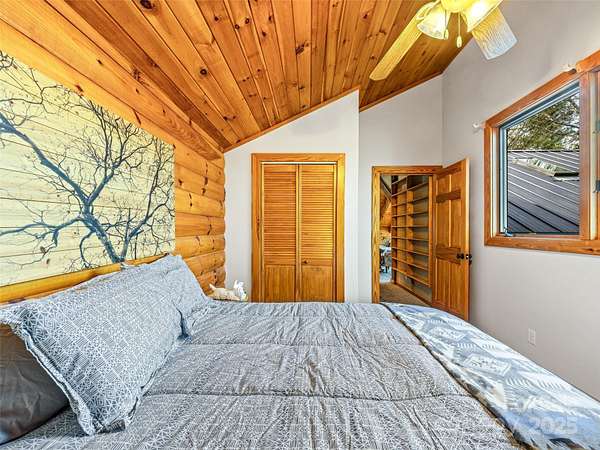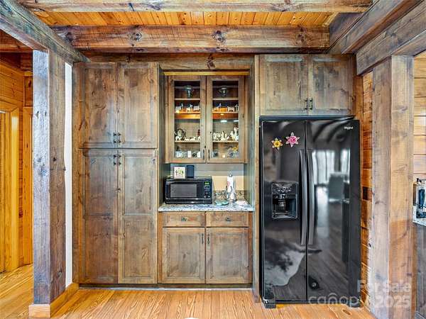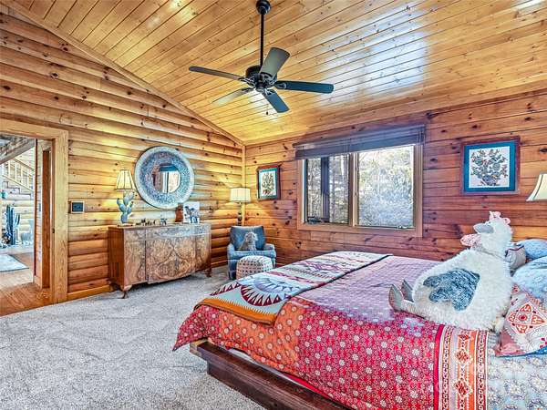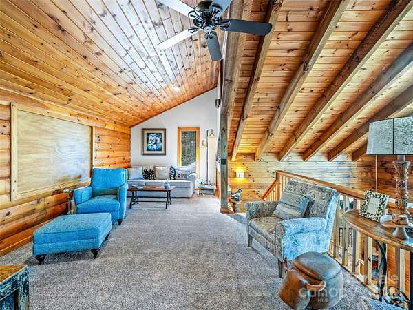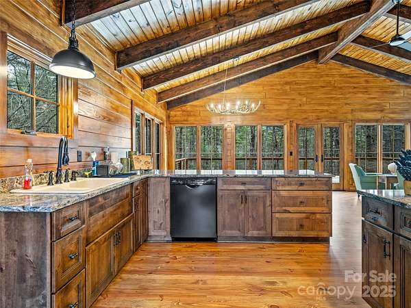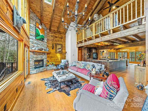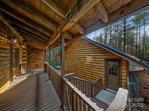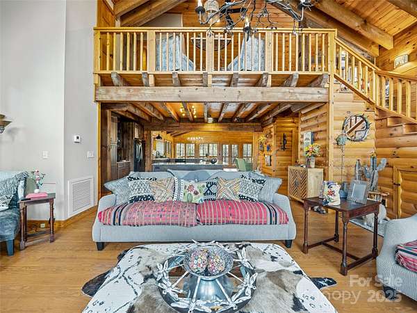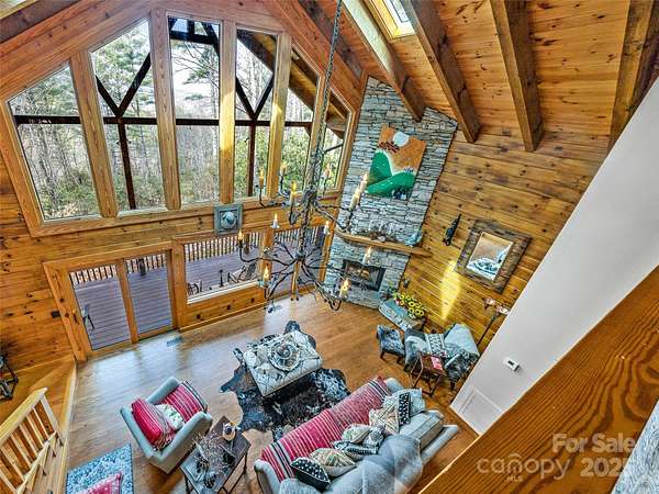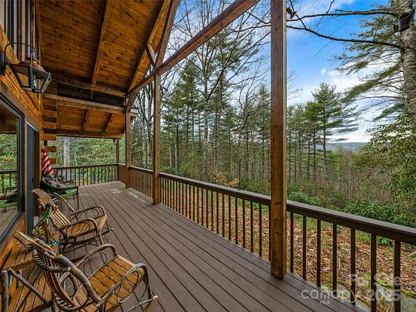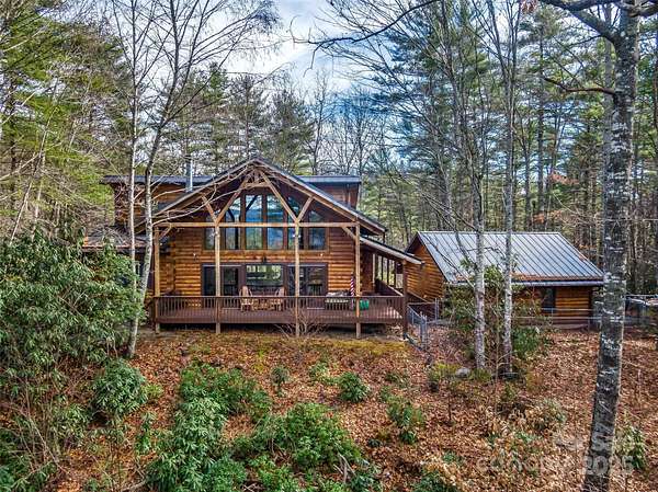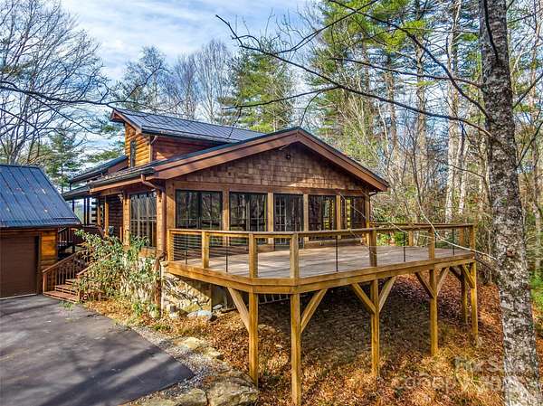 Long range views from this beautiful log cabin home located minutes from Dupont! Floor to ceiling pciture windows frame a wonderful long range view from the main living area. Recently renovated kitchen + living space and deck addition create open site lines through the main level and welcome in plenty of natural light. This space is meant for entertaining! Kitchen is well appointed, featuring top of the line appliances such as the Kucht gas range. The main level includes primary bedroom with an ensuite bath and walk in closet. Enjoy the view from your porch rocking chairs, or cozy up to the fireplace and take it all in from the comfort of your couch! The open staircase leads to the loft area which provides seprate living space from the main level. Second bedroom and full bath are tucked away on the second floor- perfect for guests. Wooded lot and additional parcel creates ample privacy. Fenced yard + dog run are perfect for your furry family members. Two car garage to keep your cars safe and provides additional storage/workshop space. Roof and HVAC replaced by owner in 2020. Kitchen reno & addition completed in 2023. 10 minutes to DuPont State Forest. 10 miles to downtown Brevard. 30 minutes to Asheville Regional Airport.