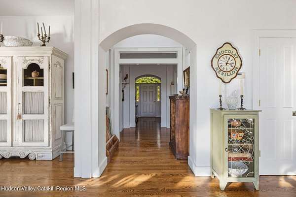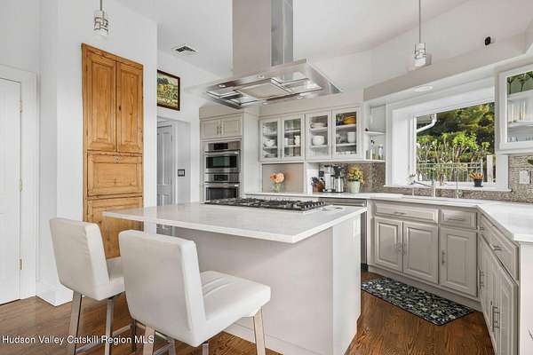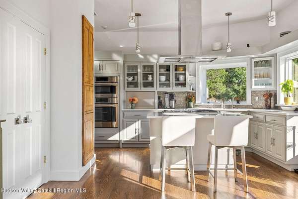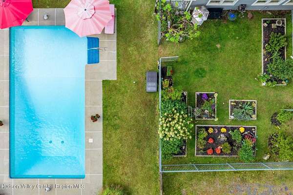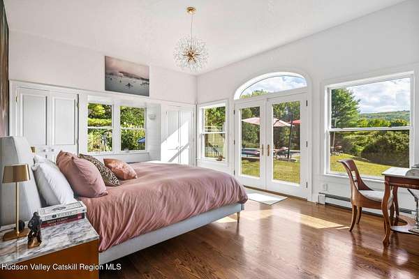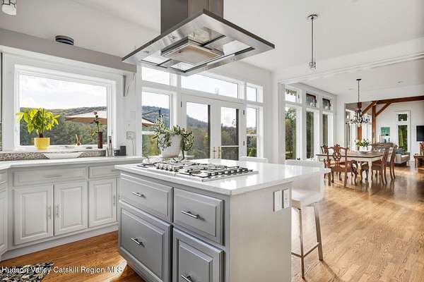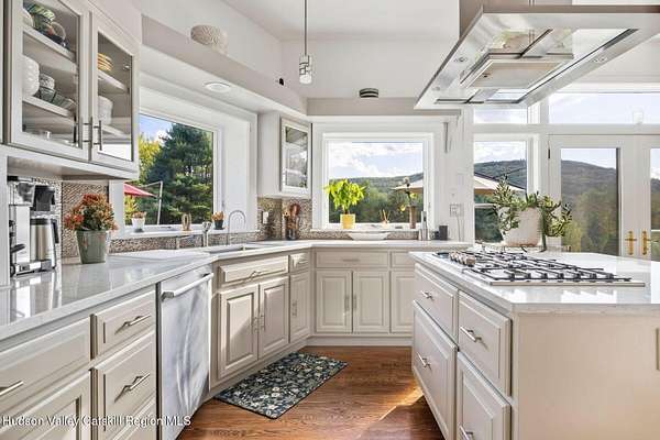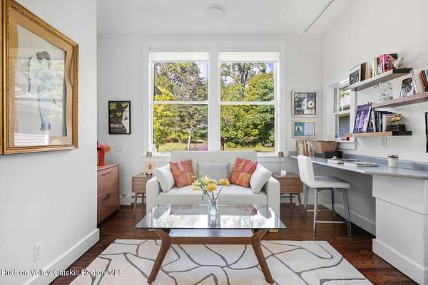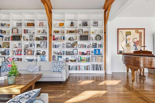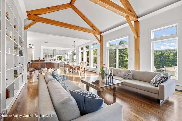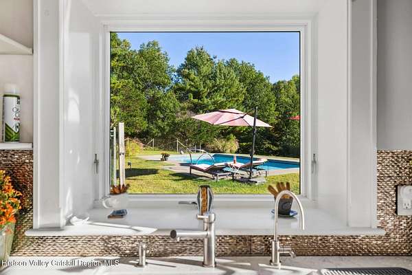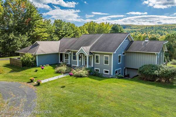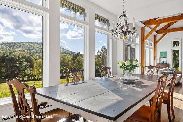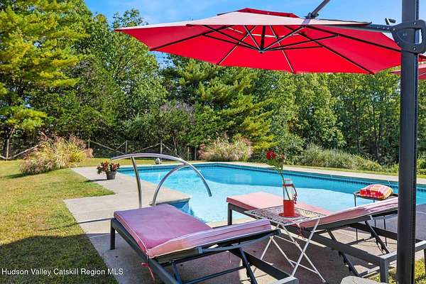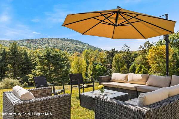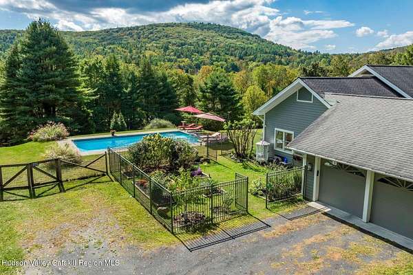 A secluded mountain escape awaits you in one of Woodstock's preeminent neighborhoods. Tucked away on Cooper Lake Road-famous for its dramatic lake and mountain vistas-this home offers privacy while being just minutes from the town's legendary music venues, galleries, and fine dining. The welcoming front entry of this home unfolds to an airy and open layout accented by soaring beamed ceilings and walls of glass that frame amazing views of the mountains, meadow, forest and sky. Sunlight pours into the expansive living and dining areas, where rich hardwood floors and clean architectural lines create a warm yet sophisticated atmosphere. A wall of floor-to-ceiling built-in shelving in the living room invites you to display cherished books, art, music, and memories-a space that sparks creativity and conversation. A well-appointed chef's kitchen, ideal for both intimate meals and grand entertaining, has splendid views of the garden and in-ground pool and flows seamlessly into the main living spaces. The primary suite offers peaceful, bucolic views, a spa-like bath and large walk-in closet. Two additional bedrooms, one currently used as an office, and a renovated full bath complete this main level. In addition to the ease and comfort of single level living, this home has the added benefit of a versatile lower level that opens to the outdoors, has its own bedroom and full bath, perfect for visitors, a media lounge, gym, work space or creative studio. The grounds are a mix of level lawn, gently sloping meadows leading the eye toward the mountain, with woods surrounding the property lines for privacy, A wonderful in-ground pool area is just steps from the house and adjacent to the fenced in vegetable and perennial flower garden. A 3D Walkthrough Tour is available in the digital Lookbook or by request.