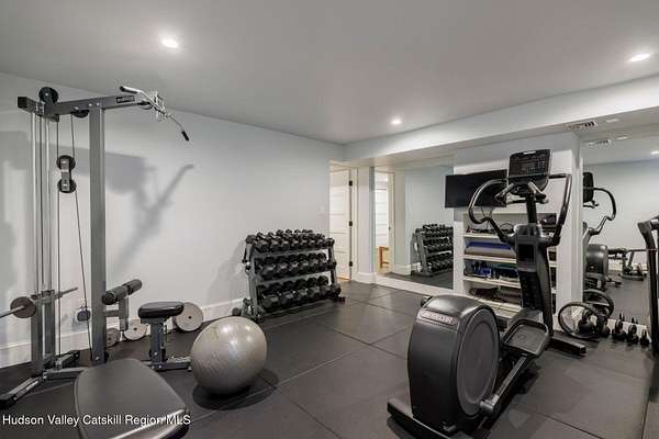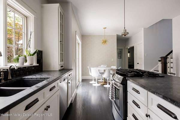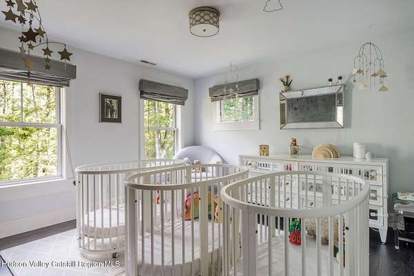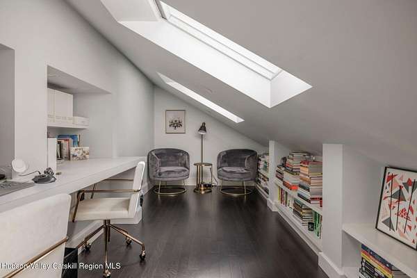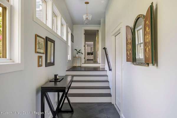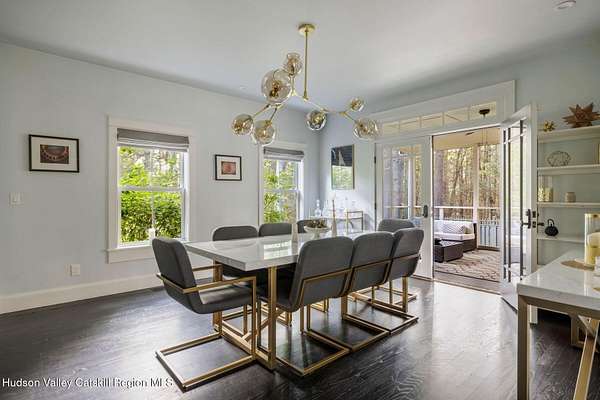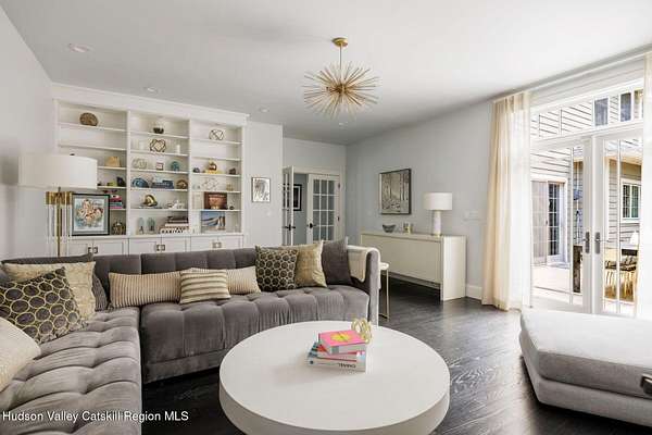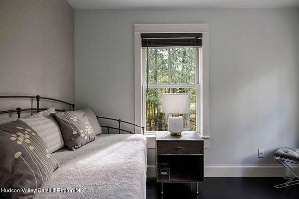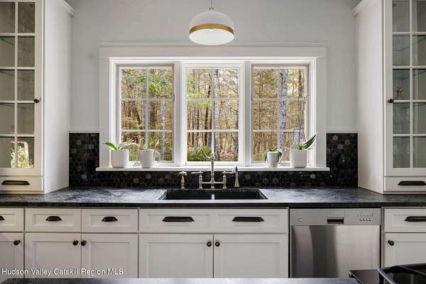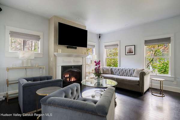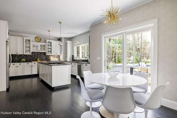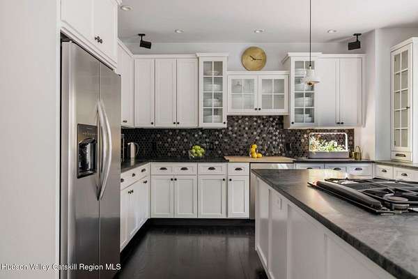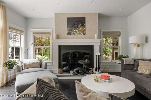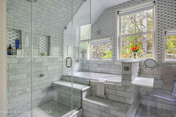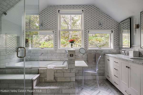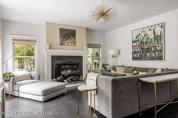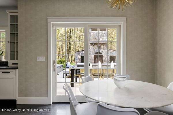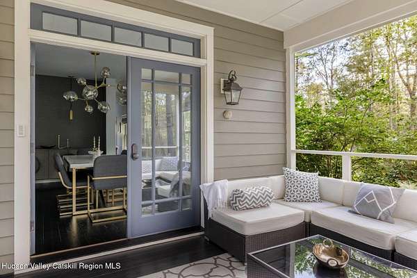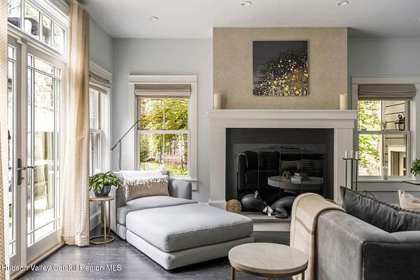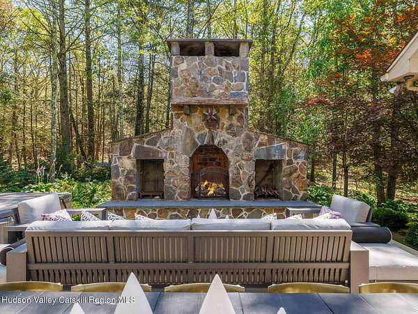 Wind along quiet country roads to the end of a private cul-de-sac and discover a magical retreat where timeless elegance meets modern comfort. Beyond the electronic gates, manicured grounds framed by mature woodland set the stage for this four-bedroom, four-bathroom, 4,700-square-foot custom residence. Outdoor living is at its finest with a sweeping bluestone patio and hot tub, a serene screened porch, and a spacious deck anchored by a dramatic river-rock fireplace. Every space is designed to celebrate the Hudson Valley lifestyle, from summer gatherings to crisp autumn evenings by the fire. A stately entrance introduces a home that gracefully balances grandeur with comfort. The gourmet eat-in kitchen features custom cabinetry, soapstone counters, stainless steel appliances, double dishwashers, and a walk-in pantry. Ideally suited for entertaining, it flows seamlessly into the formal dining room and screened porch and into the outdoor gathering spaces with their river-rock fireplace and hot tub. A grand living room with French doors opens to the private patio, filling the space with natural light and creating an effortless connection between indoors and out. A comfortable family room offers a second retreat, ideal for cozy evenings. Each room is warmed by its own fireplace, infusing the home with character and charm. The newly designed private wing hosts a versatile suite with a spacious bedroom, an ensuite marble bath, an office nook, and direct access to the home's luxurious sauna and room for a fully equipped gym. Completed in 2019, this wing is ideally suited for a primary retreat, guest accommodations, or in-law and nanny quarters. Additionally, three generously sized bedrooms and two full baths with soapstone countertops offer comfort and flexibility. With two primary suites, the home provides a rare layout. Each ensuite bath features double vanities with a shower, and an oversized tub, creating a sanctuary of luxury. Every detail has been thoughtfully considered, from mahogany porch floors, Marvin windows, and oak flooring to central air, a whole-house generator, a water filtration system, and two sets of washers and dryers. Exterior lighting and a complete irrigation system enhance the manicured setting, while custom wooden shutters lend enduring charm. An attached two-car garage completes the home. Nestled within a private woodland clearing yet just minutes from Woodstock, Saugerties, skiing, schools, and healthcare, this residence offers tranquility, seclusion, and convenience, embodying the best of the Hudson Valley. A 3D Walkthrough Tour is available in the digital Lookbook or by request from the listing agent.