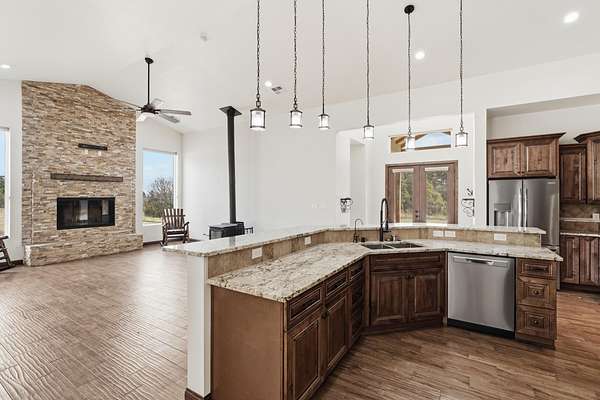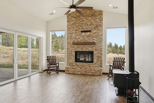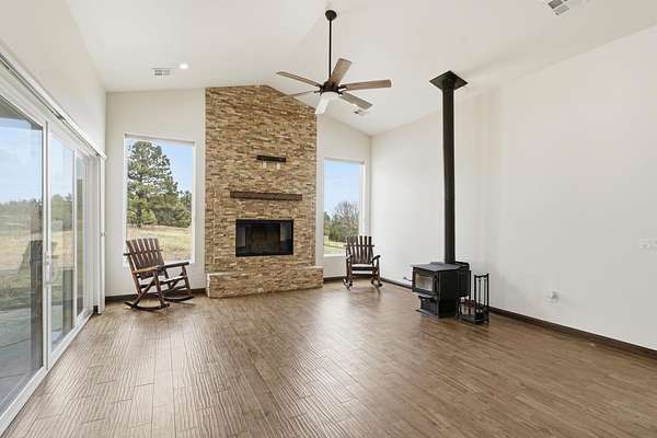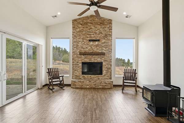 Welcome to this beautifully built 2023 home, that sits on 6.6 acres nestled in the peaceful East mountains just 20 minutes away from Albuquerque offering privacy, space and modern comfort with no HOA restrictions. Designed with both functionality and style in mind, this property features 2,630 sq ft and an oversized 3-car garage with extended depth-perfect for vehicles, storage or a workshop. This home offers two wood/propane fireplaces and another wood burning stove in the very spacious living room. All utilities can be found on this property, a well has already been established as high producing. There is also a spacious shed on the south side of the property which is perfect for extra storage. This property offers the perfect balance of rural freedom and modern convenience.