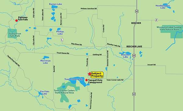 Stay on County Road L (Beecher Lake Road) to Smeester School Road. Stay on Smeester School Road until you reach Gehling Road. Follow Gehling Road to French Road. Head down French Road until you see the real estate signs from our sister company. (Loon Lake Realty) Look for the stakes at the road. This is lot 9