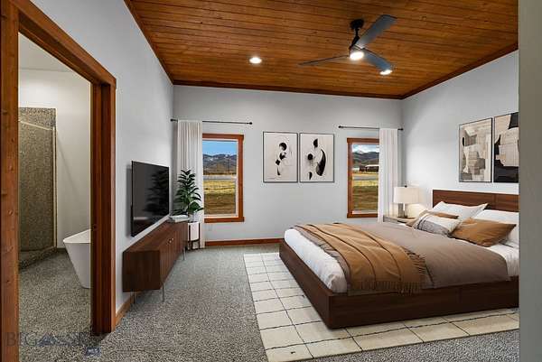 Step into this beautifully crafted, newly built custom home located in the highly sought-after Homestead Subdivision, sitting on approximately 2.62 acres of scenic land. Boasting 2,080 square feet of thoughtfully designed living space, this home seamlessly combines modern conveniences with a touch of rustic charm. The open-concept layout enhances the flow of the main living areas, while the home features three generously sized bedrooms and two and a half bathrooms. The primary bedroom serves as a true sanctuary, complete with a large walk-in closet and a luxurious en-suite bathroom featuring a deep soaker tub. Ideal for both relaxing and entertaining, the heart of the home lies in the expansive kitchen and living room area. Vaulted ceilings with exposed beams create an inviting atmosphere, and the natural gas fireplace brings warmth to the living room. Outside, you'll enjoy a spacious 2-car garage and a covered wrap-around patio, offering both functionality and leisure. With breathtaking mountain views and a design that blends beauty with practicality, this home is just a short drive from Sheridan's amenities, making it the perfect retreat with easy access to everything you need.
