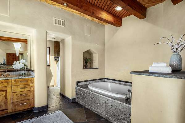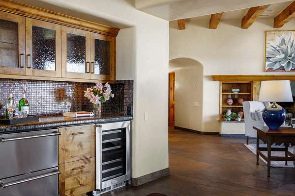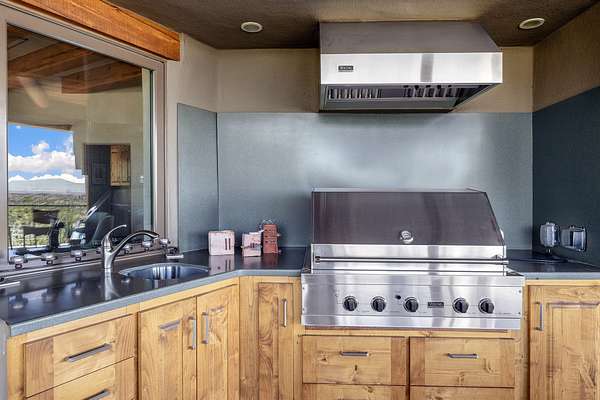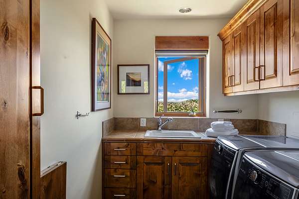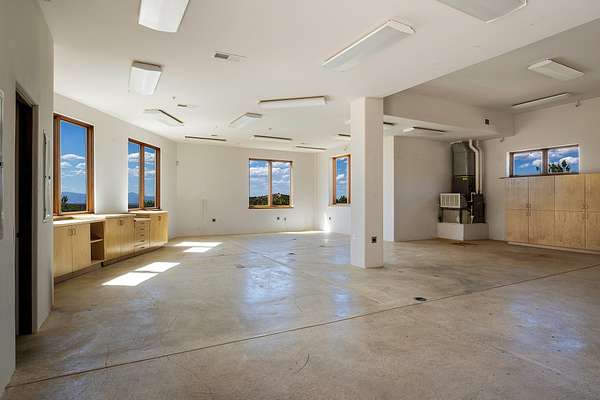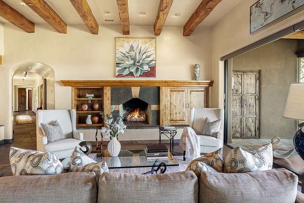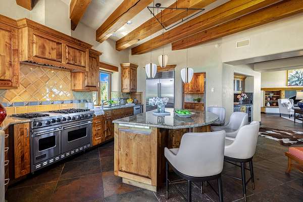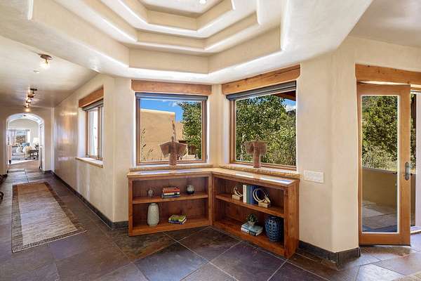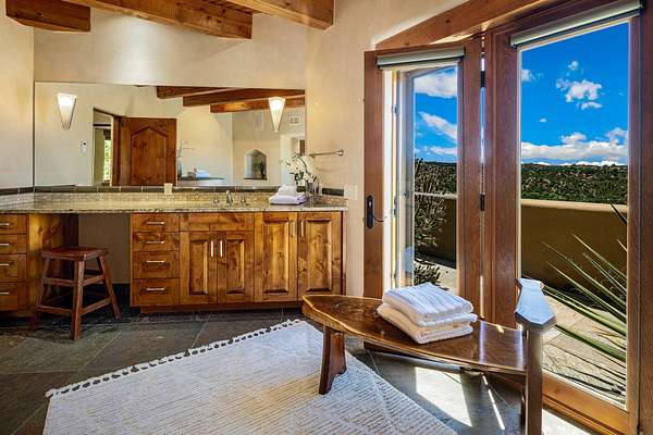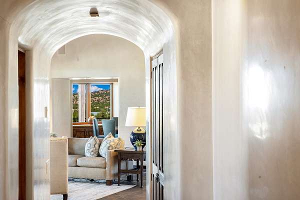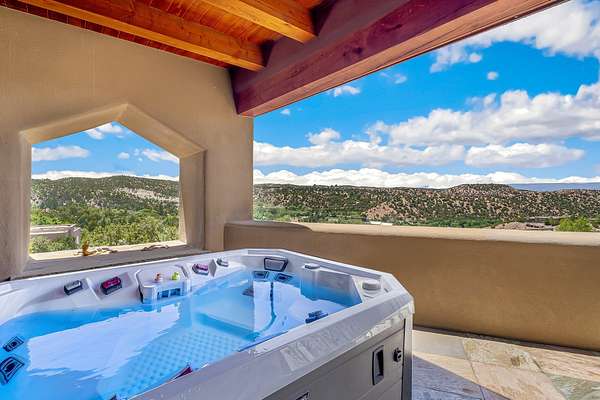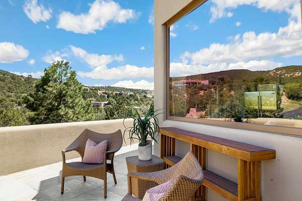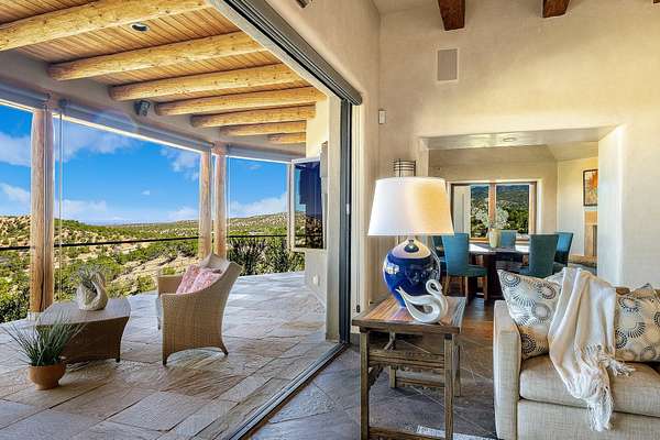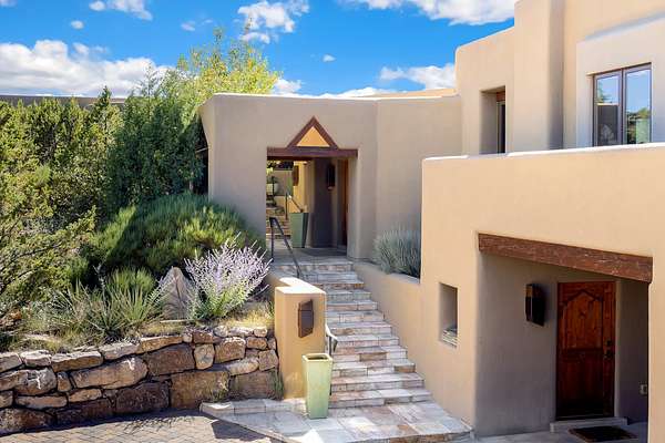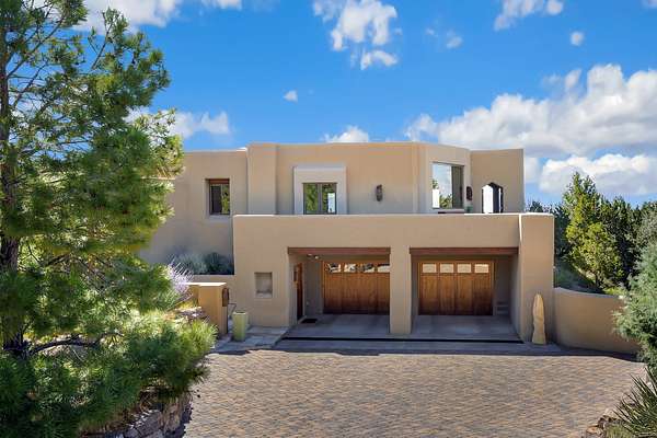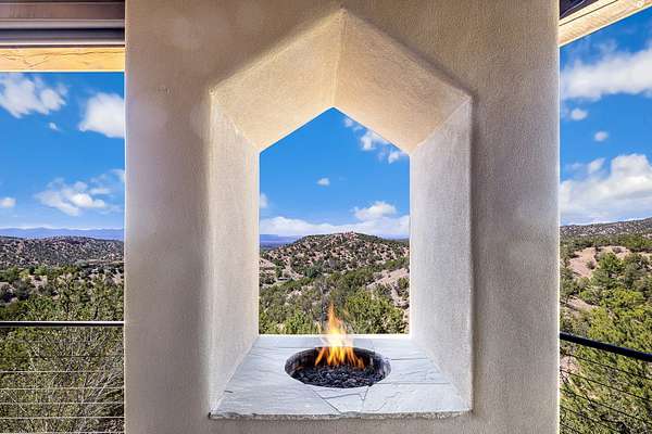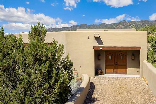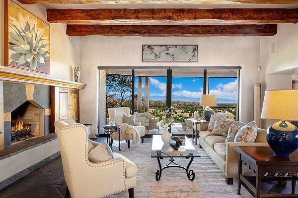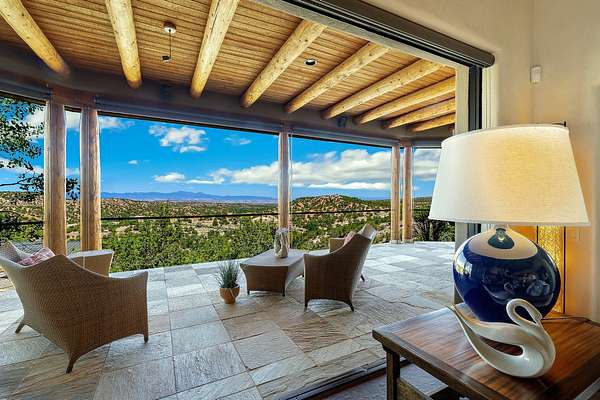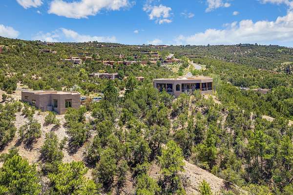 An exceptional Value in Bishop's Lodge Hills & Villas! Perched above the Tesuque hills on 2.38 acres, 9 Lodge Circle offers a rare combination of panoramic mountain views and a unique Southwestern design-all just minutes from the Plaza. Set within the gated community of Bishop's Lodge Hills and Villas, this extraordinary property includes a 4,300 sq. ft. main residence and a versatile 1,500 sq. ft. detached studio, with commanding views of both the Jemez and Sangre de Cristo mountain ranges. The main home is a masterclass in design, showcasing a unique architectural blend of contemporary and Southwestern influences. The central living area features disappearing glass doors that open to a sweeping west-facing portal-perfect for soaking in Santa Fe's golden-hour light. An outdoor cantina with a gas fireplace and built-in grill sets the stage for elegant al fresco entertaining.The chef's kitchen is equally inspired, with a spacious island, cozy banco, butler's pantry, dumbwaiter, and an expansive picture window framing the Sangres. A dramatic dining room with a raised octagonal ceiling and fireplace offers a captivating setting for both intimate and grand gatherings. The primary suite is a private sanctuary, complete with a secluded hot tub for sunset views and stargazing. Two guest suites each offer ensuite baths, while a separate office provides quiet space for work or reflection. The detached 1,500 sq. ft. studio-originally a woodworking shop- brimming with potential as a creative studio, gym, or guest quarters. As a bonus, ownership includes social membership privileges at the world-renowned Bishop's Lodge Resort. With its new price of $3,395,000, this exceptional property presents a compelling value in one of Santa Fe's most coveted locations-where design, privacy, and inspiration converge.