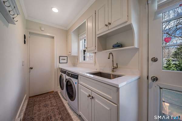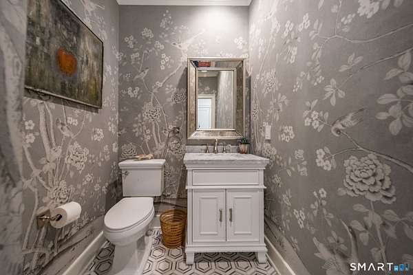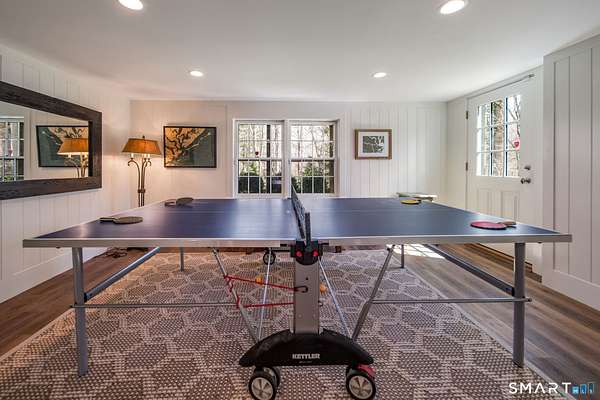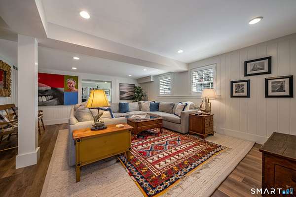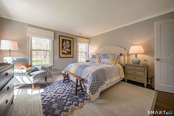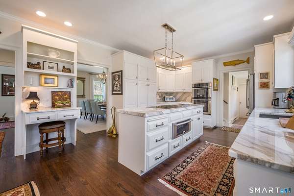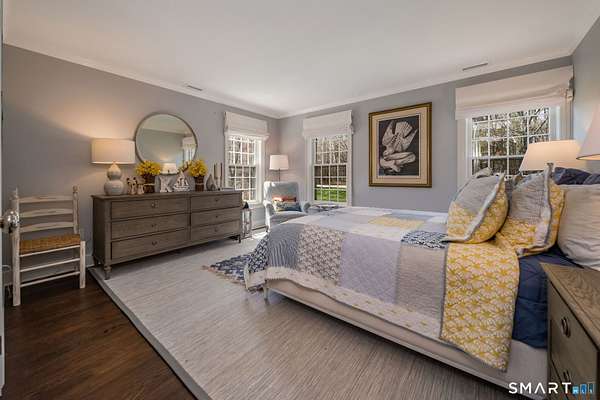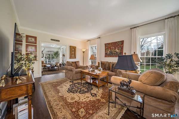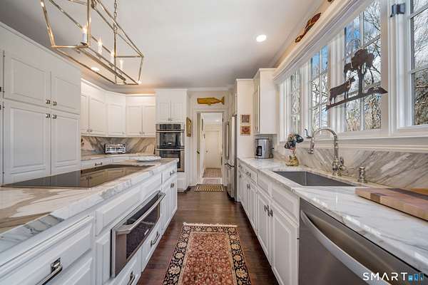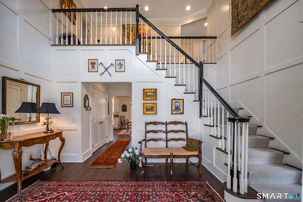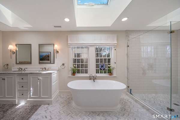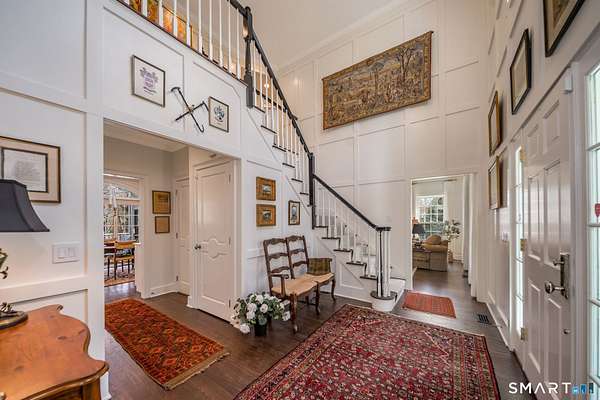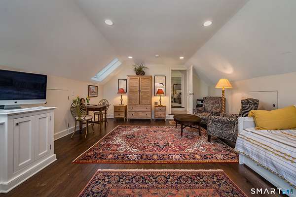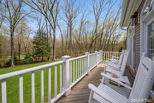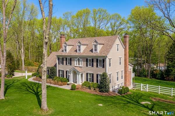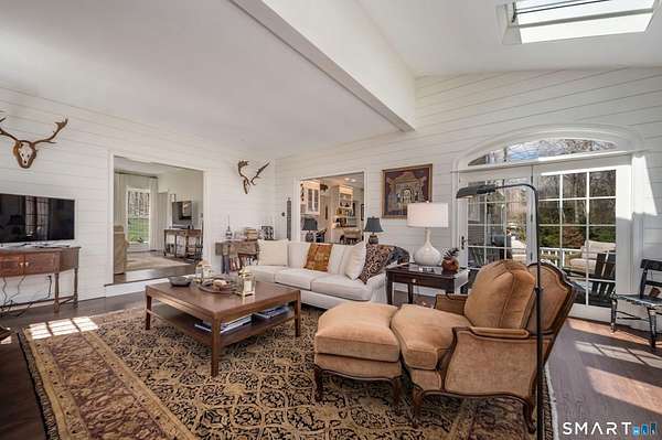 Nestled within one of Old Lyme's most desirable neighborhoods, this exceptional Colonial offers a refined yet welcoming lifestyle defined by natural light, seamless flow, and timeless appeal. Sunlight pours through multiple skylights and thoughtfully placed windows, illuminating rich hardwood floors, detailed trim, and a gracious foyer that sets the tone for the home's elegant yet comfortable design. The main level blends formal and casual living effortlessly, anchored by a dramatic great room with a striking floor-to-ceiling fireplace. In the living room and kitchen, French doors with arched leaded glass add architectural charm and open beautifully to the expansive deck and yard, creating a seamless connection to the outdoors.The kitchen is designed for both everyday living and entertaining, featuring marble countertops, top-tier appliances, a wine bar refrigerator, generous workspace, and easy access to the backyard. Upstairs, the primary suite serves as a private retreat with its own fireplace, spacious bath with skylights, multiple closets, and an adjoining large finished bonus space, also with skylights-ideal for a home office, craft room, or sitting room. Additional bedrooms are well proportioned and complemented by updated baths, while the insulated third-floor attic offers excellent storage or future expansion potential.The walk-out lower level adds versatility with finished rooms that open directly to the outdoors.