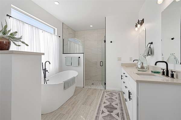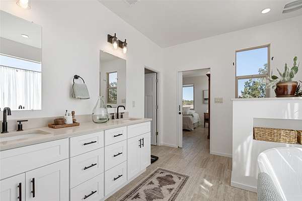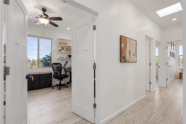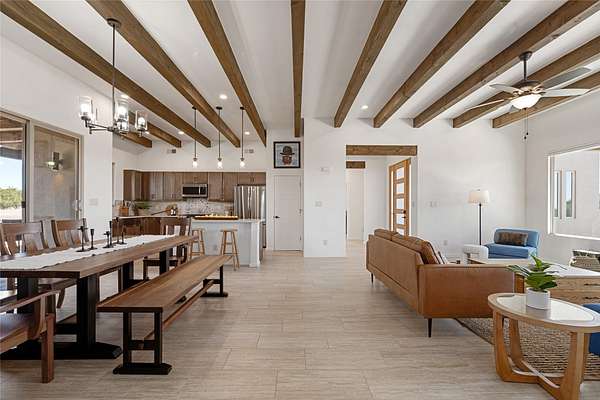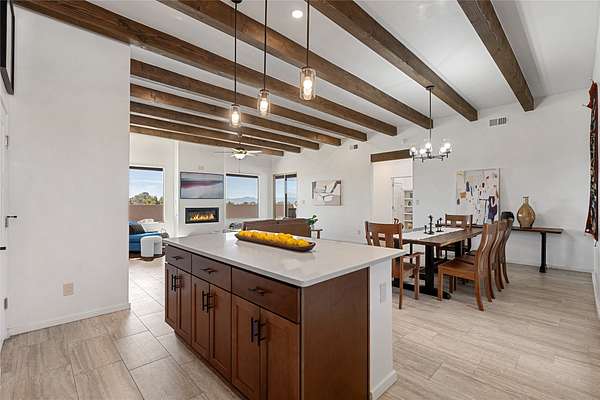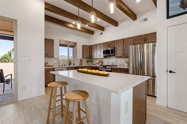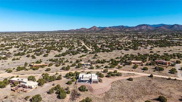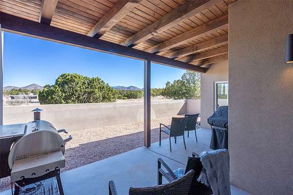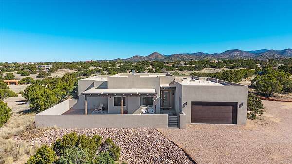 Tucked down a quiet cul-de-sac lane, this beautifully maintained contemporary Pueblo-style home offers the best of Eldorado living. The mountain views, open space, and a thoughtfully designed floor plan, all in a setting that feels both private and serene. Set on 1.45 acres, the south-facing home captures light and views all day long, with meadows and open space as your backdrop. Inside, the single level, split-bedroom layout delivers open-concept living and dining at its finest. There is generous flow between spaces that feels both connected and comfortable. The great room opens through sliding glass doors to a covered patio and courtyard, creating seamless indoor-outdoor living ideal for entertaining or simply soaking in the New Mexico sky. The kitchen is a stand out. The large center island, quartz countertops, stainless steel appliances, and pantry make it as functional as it is beautiful. The spacious primary suite, separated from the guest rooms for privacy, features a spa-inspired bath with a large soaking tub, separate shower, dual vanity sinks, a skylight, and a generous walk-in closet. Three additional bedrooms offer flexibility - the fourth room is ideally configured as a home office, den, or media room, adapting easily to your needs. A gas fireplace, tile floors throughout, forced heat, and central air conditioning ensure year-round comfort. The attached 2-car garage is insulated and finished, adding everyday practicality to this turn-key package. Eldorado is one of Santa Fe's most sought-after communities - just 20 minutes from the historic Plaza, with miles of walking and riding trails, acres of protected wilderness, shopping, dining, a library, senior center, K-8 school, and a Community Center with pool, athletic facilities, and a dog park.