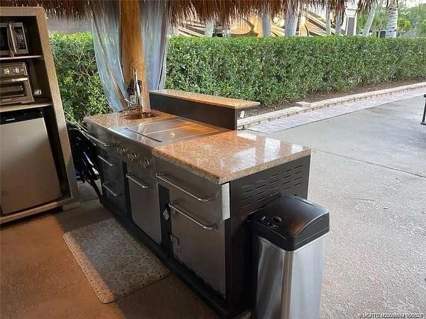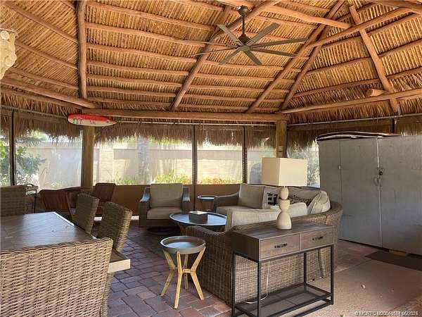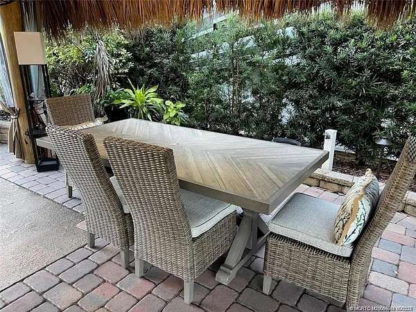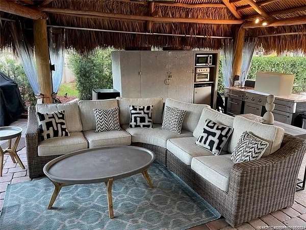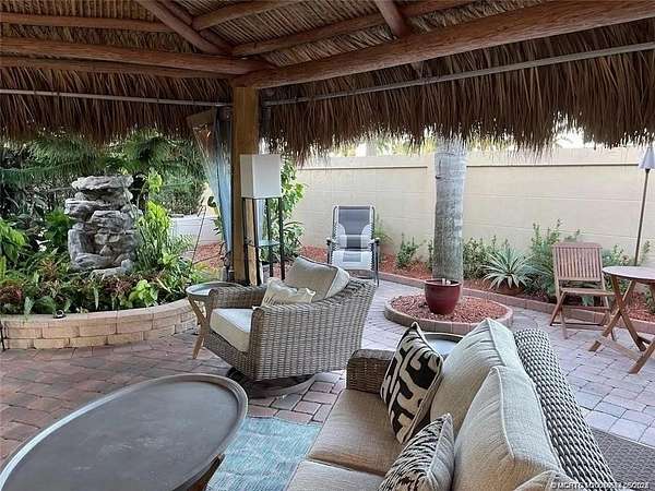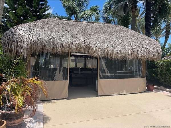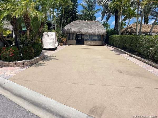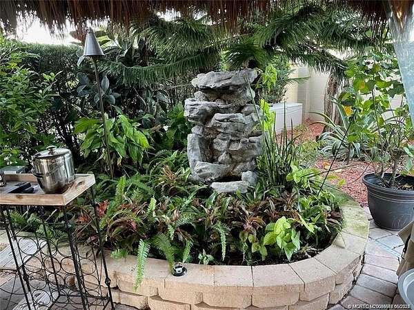 Discover tranquility and sophistication in this meticulously landscaped oasis, designed with privacy at the forefront. With a spacious tiki with Kitchen and custom built-in storage, it provides the perfect blend of functionality and style. Immerse yourself in luxury living with every detail curated to enhance your lifestyle. The price includes an array of furniture, a captivating fountain, and convenient storage units arranged ensuring seamless living from the moment you arrive. Experience the enchantment of the outdoors with a $5,000 lighting system, seamlessly integrating tiki torches with LED lighting, creating a mesmerizing ambiance that illuminates the landscape with warmth and elegance. Retreat to the tranquil rear seating area, offering a private sanctuary to unwind and recharge amidst lush surroundings. Luxury furnishings added just last year, elevate the interior to new heights of opulence. This exceptional property is move-in ready. Welcome home to a lifestyle of relaxation.
