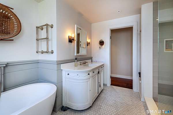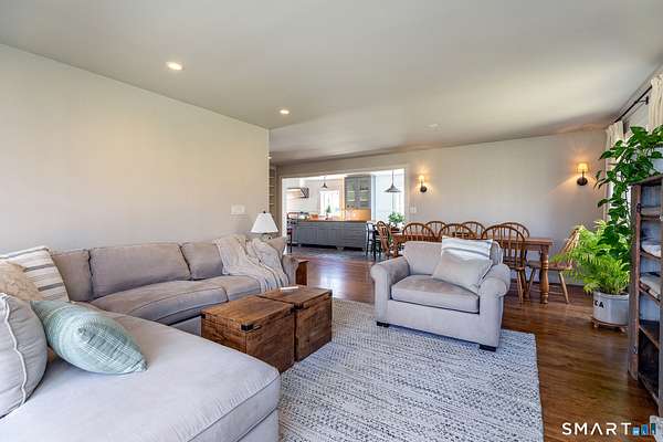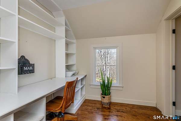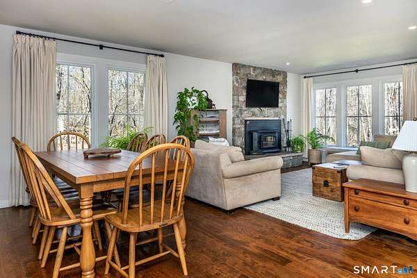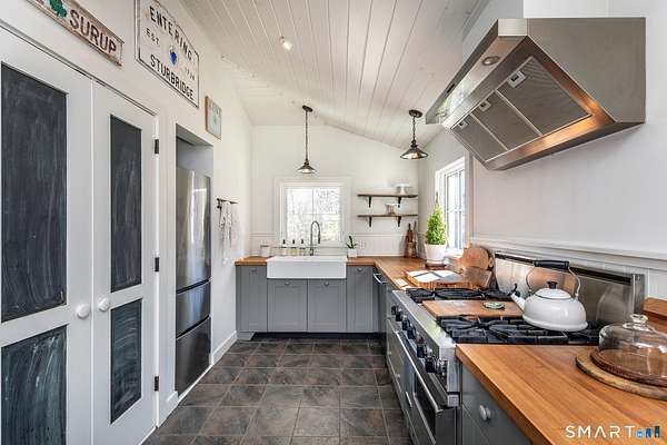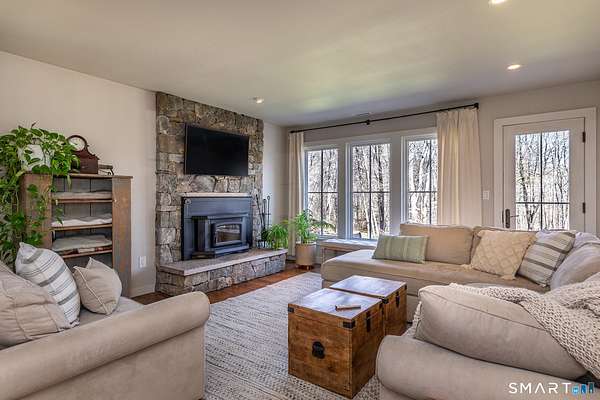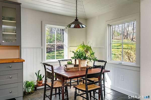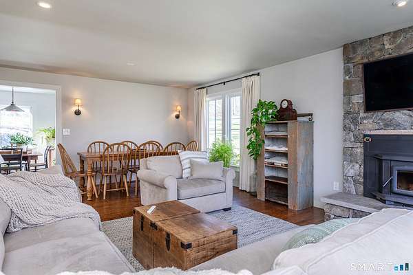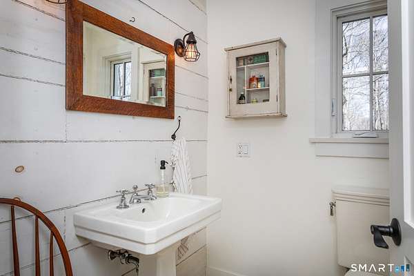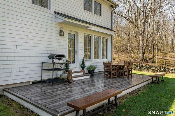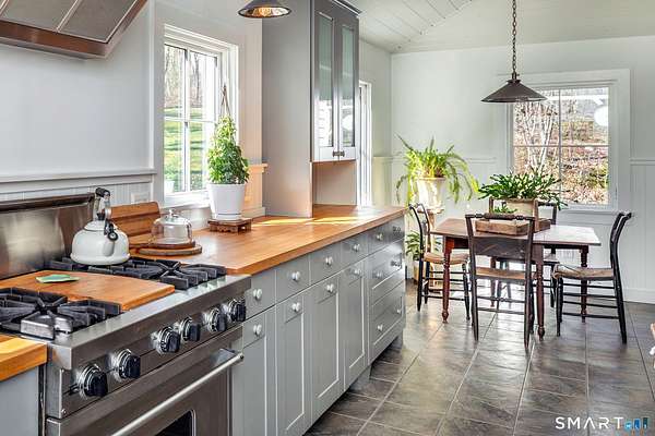 Set on 14+ private acres abutting Connecticut State land, this chic three-bedroom farmhouse offers the kind of quiet that's increasingly hard to find - and interiors that make you want to stay. The main floor is built around an open, light-filled plan that flows naturally from a chef's kitchen, featuring shaker-style cabinetry, butcher block counters, a farmhouse sink, and a professional range, through a generous dining area and into a living room anchored by a fieldstone fireplace. Step outside and relax or entertain on a back deck overlooking the lawn and surrounding forest. A powder room and laundry complete the level. Upstairs, a comfortable sitting area with a second fireplace connects two well-proportioned bedrooms sharing a full bath. The primary suite is a proper retreat: a handsome built-out office, a spa bath with soaking tub, and a walk-in closet done right. Outside, a classic red barn with metal roof adds character and utility. The Litchfield Hills at their best: two hours from Manhattan, with Kent's village life, Appalachian Trail, the Housatonic River, and Mohawk Ski Mountain all within easy reach.