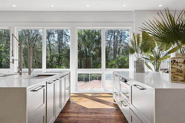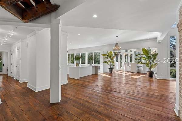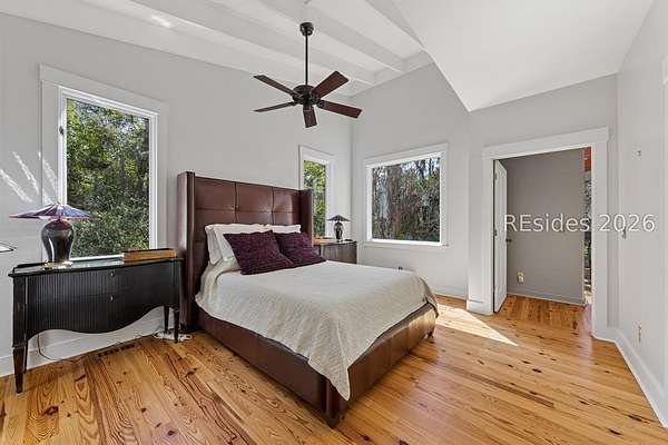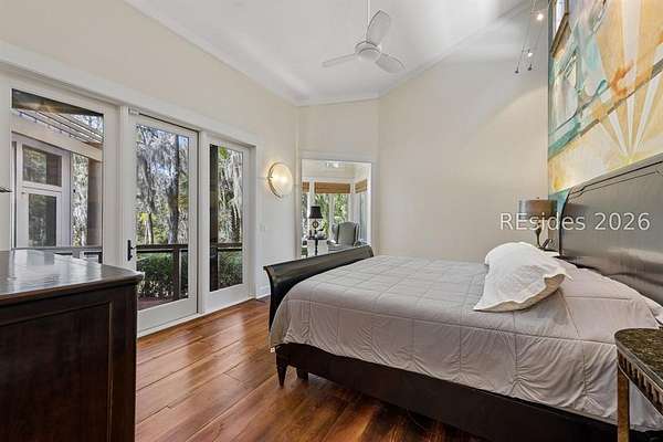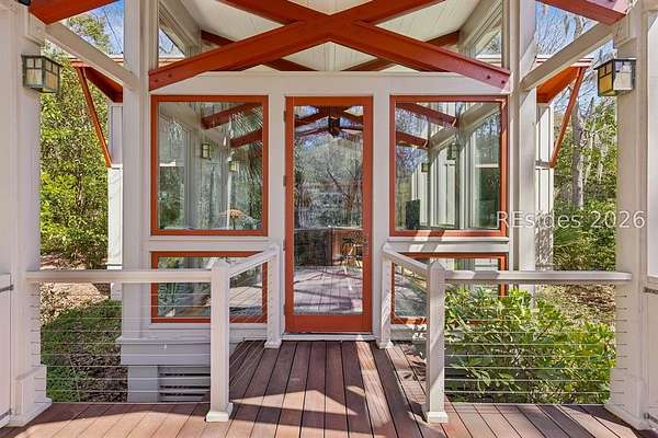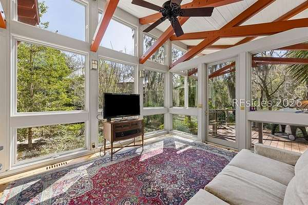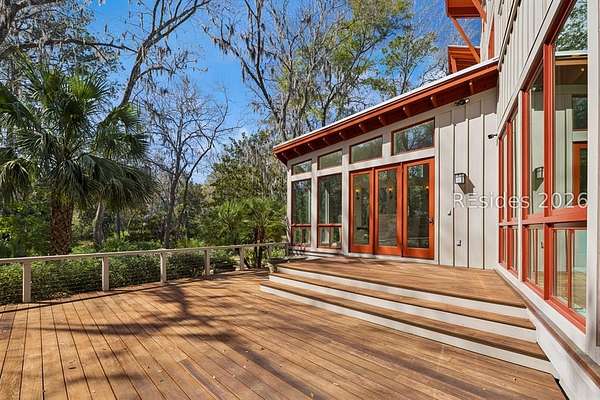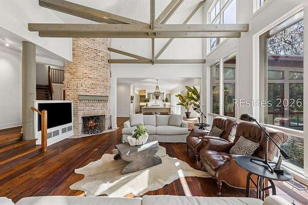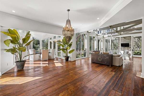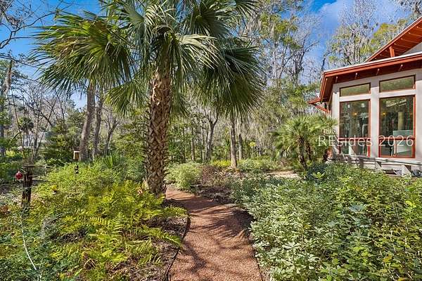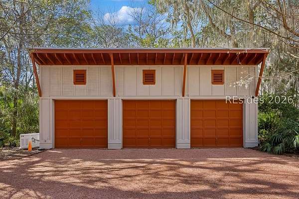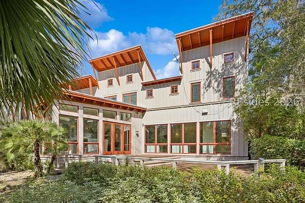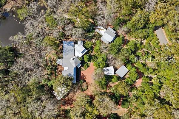 Designed to blend contemporary architecture with classic Lowcountry elements, this remarkable compound was envisioned by architect Chris Schmitt as a collection of five distinct structures including the main residence, guest house, workshop, studio, and a three bay garage. The guest house was completed in 1998, with the remaining buildings added over time, culminating in the completion of the main residence in 2004.The AIA award winning main residence is extraordinary not only for its innovative design but also for the exceptional quality of materials and craftsmanship throughout. Perfectly proportioned details, balance, and scale create a home of striking visual appeal, enhanced by exposed beams, vaulted ceilings, and antique heart pine flooring milled in Savannah in the 19th century. A custom wall mural by artist Jordi Pedrola further distinguishes the interior. At the heart of the home, the great room features soaring ceilings, exposed trusses, and tall windows that flood the space with natural light. The gourmet kitchen flows seamlessly into the dining room and sunroom, all of which overlook Rice Gate Pond and open easily to the home's extensive outdoor living spaces including a screened porch and approximately 1,000 square feet of outdoor living area designed for relaxing and entertaining. The spacious ground floor primary suite offers a private retreat with direct access to an outdoor spa and shower. The luxurious primary bath features a steam shower. Two beautifully appointed bedrooms are located on the second floor. The guest house echoes the distinctive inverted roofline of the main home's sunroom, with a dramatic living room featuring floor to ceiling glass and peaceful views of the surrounding forest. Complete with a small kitchen, dining area, and two bedrooms with baths, it offers visitors both comfort and privacy. Raised walkways connect the buildings and enhance the sense of a thoughtfully designed compound. Additional structures include a versatile entertainment building with a chef kitchen and a large garage door that opens for indoor outdoor gatherings, as well as a separate studio with its own bathroom ideal for creative work or a private office. The property also includes a wine cellar, custom lighting system throughout, and a spacious three car garage. The landscape plan was created by highly regarded landscape architect Thomas Angell, who artfully blends formal landscaping with the natural beauty of Spring Island.