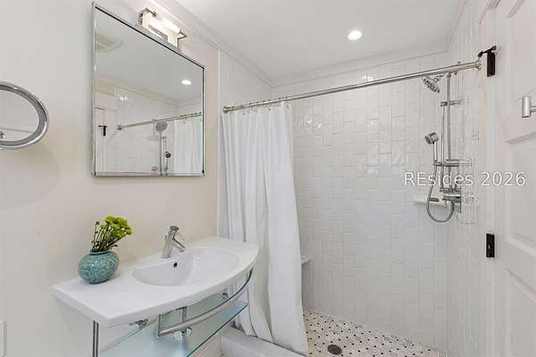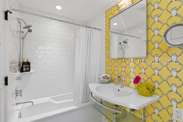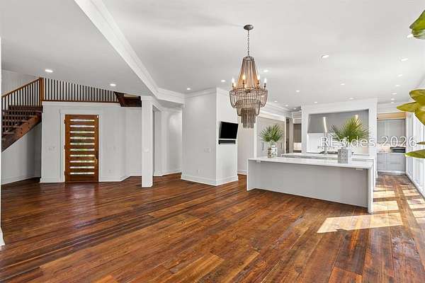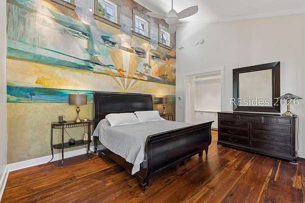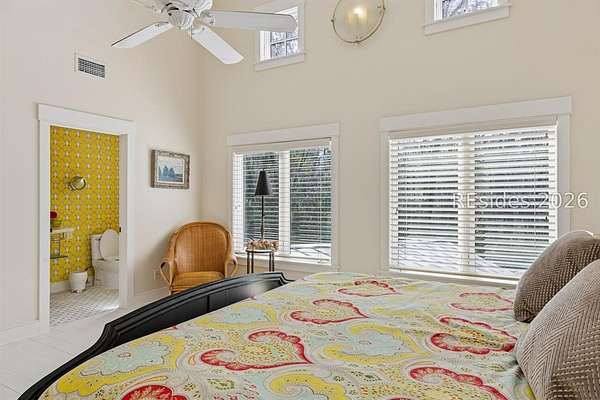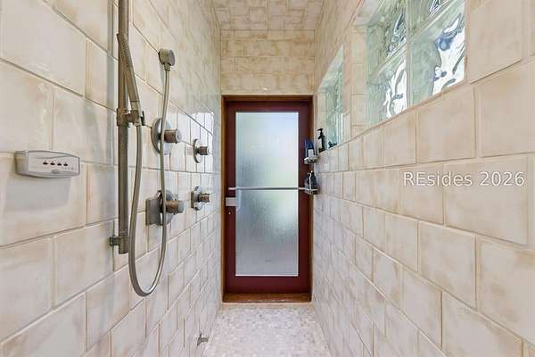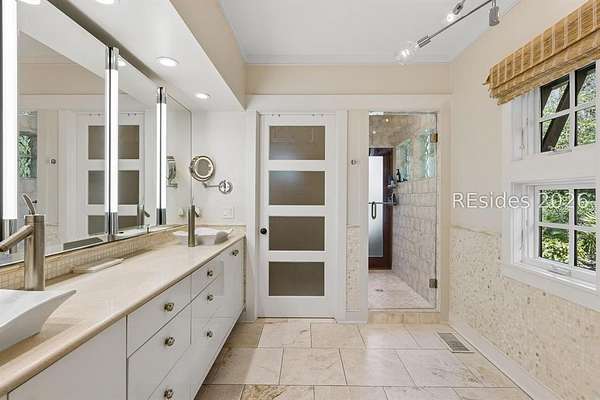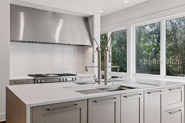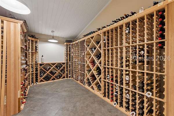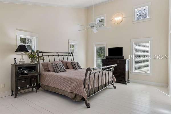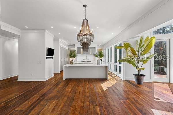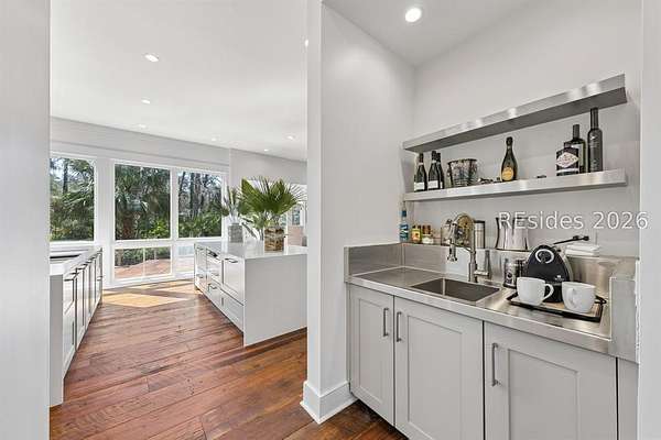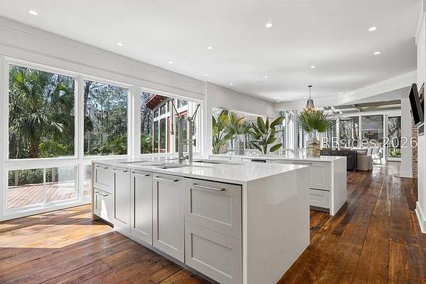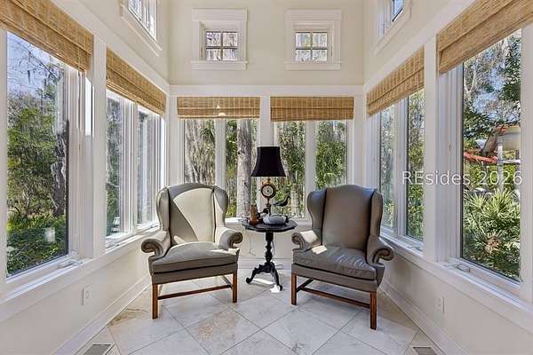 Designed to blend contemporary architecture with classic Lowcountry elements, this remarkable compound was envisioned by architect Chris Schmitt as a collection of five distinct structures including the main residence, guest house, workshop, studio, and a three bay garage. The guest house was completed in 1998, with the remaining buildings added over time, culminating in the completion of the main residence in 2004.The AIA award winning main residence is extraordinary not only for its innovative design but also for the exceptional quality of materials and craftsmanship throughout. Perfectly proportioned details, balance, and scale create a home of striking visual appeal, enhanced by exposed beams, vaulted ceilings, and antique heart pine flooring milled in Savannah in the 19th century. A custom wall mural by artist Jordi Pedrola further distinguishes the interior. At the heart of the home, the great room features soaring ceilings, exposed trusses, and tall windows that flood the space with natural light. The gourmet kitchen flows seamlessly into the dining room and sunroom, all of which overlook Rice Gate Pond and open easily to the home's extensive outdoor living spaces including a screened porch and approximately 1,000 square feet of outdoor living area designed for relaxing and entertaining. The spacious ground floor primary suite offers a private retreat with direct access to an outdoor spa and shower. The luxurious primary bath features a steam shower. Two beautifully appointed bedrooms are located on the second floor. The guest house echoes the distinctive inverted roofline of the main home's sunroom, with a dramatic living room featuring floor to ceiling glass and peaceful views of the surrounding forest. Complete with a small kitchen, dining area, and two bedrooms with baths, it offers visitors both comfort and privacy. Raised walkways connect the buildings and enhance the sense of a thoughtfully designed compound. Additional structures include a versatile entertainment building with a chef kitchen and a large garage door that opens for indoor outdoor gatherings, as well as a separate studio with its own bathroom ideal for creative work or a private office. The property also includes a wine cellar, custom lighting system throughout, and a spacious three car garage. The landscape plan was created by highly regarded landscape architect Thomas Angell, who artfully blends formal landscaping with the natural beauty of Spring Island.