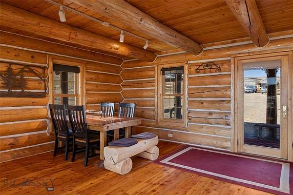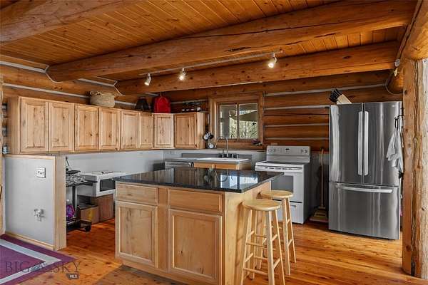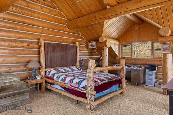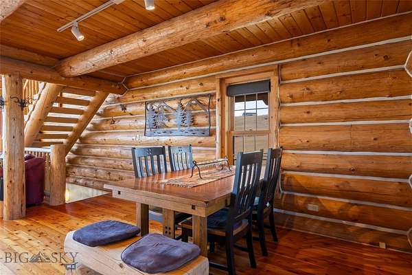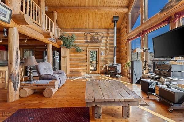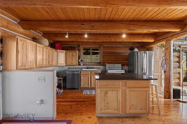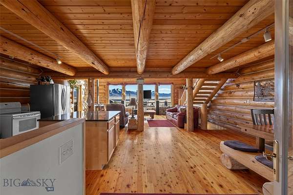 Set just outside of Ennis yet still within the Ennis community, this beautiful 2216+/- square foot (per owner) custom log home offers privacy, views, and Montana character on 5.197+/- acres of partially fenced open ground. With three levels of living space, the home is designed to capture both comfort and functionality while taking full advantage of its scenic setting. The main level features the kitchen, dining, and living areas anchored by warm log construction, pine hardwood floors, and a wood stove that adds both charm and comfort. The kitchen is currently being updated, offering the opportunity for refreshed finishes while maintaining the home's inviting layout. The lower level includes the primary bedroom, bathroom, mechanical room, and laundry. A sliding glass door opens to a deck facing east toward the Madison Range, a perfect spot to take in morning light and mountain views. The upper loft provides flexible space for guest accommodation, an office, or hobbies. Outdoor living is a highlight with a wraparound covered porch that invites you to relax and enjoy the surrounding landscape and wildlife. The property includes two 30x60 new pole barns, offering a blank slate for storage, shop space, livestock, or recreational equipment. A small dry cabin and additional shed add further versatility for guest overflow, a studio, or extra storage. Located close to the Madison River and abundant public lands, this property provides convenient access to fishing, hiking, hunting, and endless outdoor recreation. This subdivision boasts private stocked lakes. The home is served by a well and septic, with fiber internet available to the house but not yet connected. Kitchen does not have all the cabinets & can be finished your way.