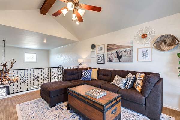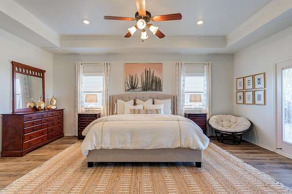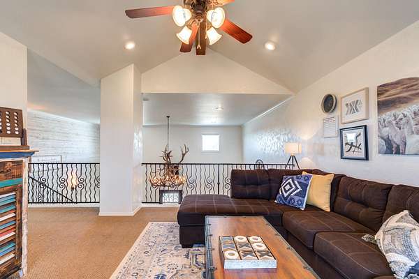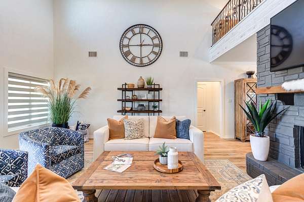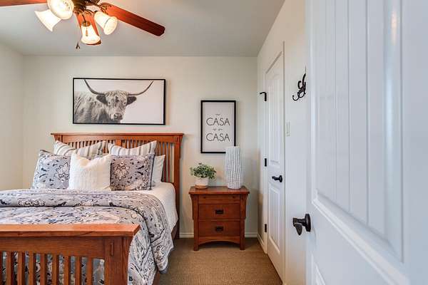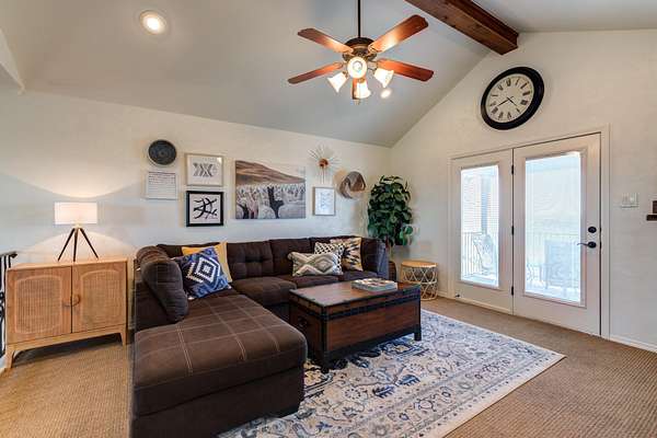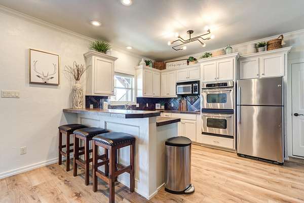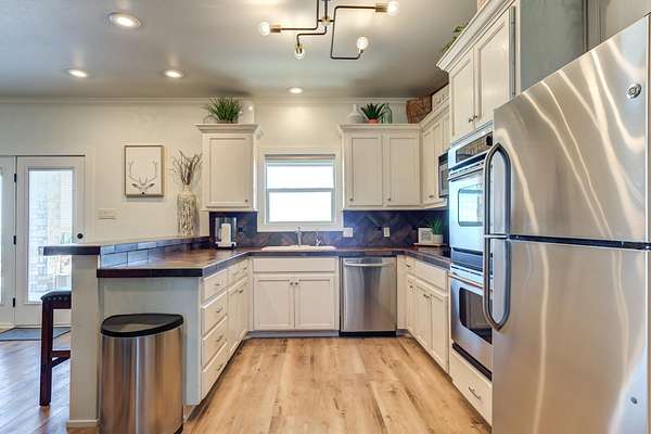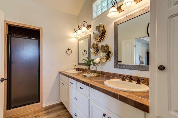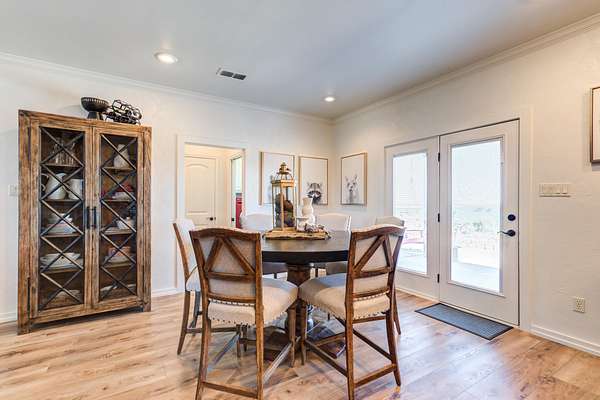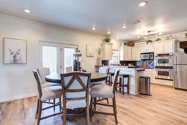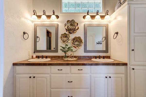 - Bar, Beamed Ceilings, Breakfast Bar, Built-In Features, Ceiling Fan(s), Chandelier, Crown Molding, Double Vanity, Eat-In Kitchen, High Ceilings, Open Floorplan, Pantry, Primary Downstairs, Tile Counters, Walk-In Closet(s)