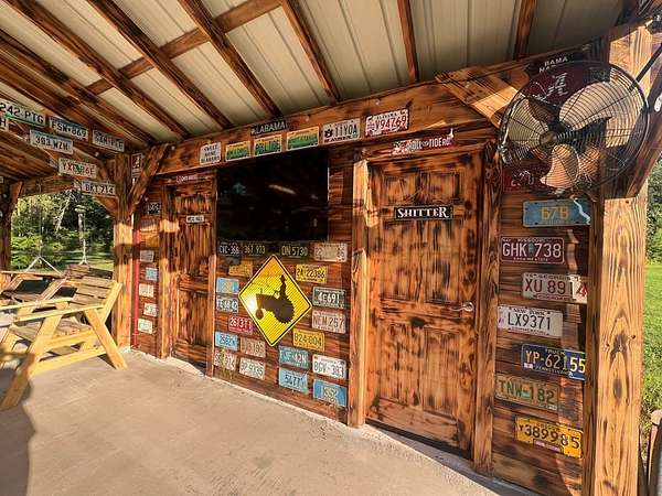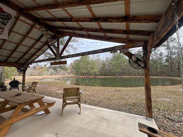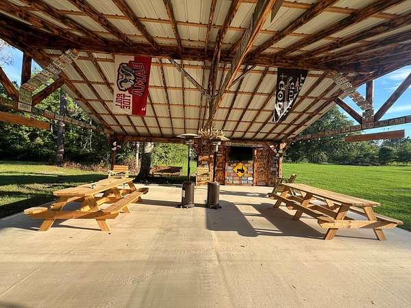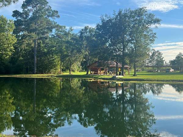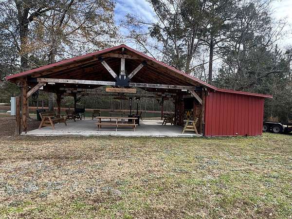 12.86 acre plot of land with pond and pavilion. The covered pavilion has a half bath, kitchen set up (stove, refrigerator and small microwave) picnic tables and outdoor fans installed. About 3 acres is cleared around the pavilion. The remaining wooded area has a custom deer stand already set up for hunting season.