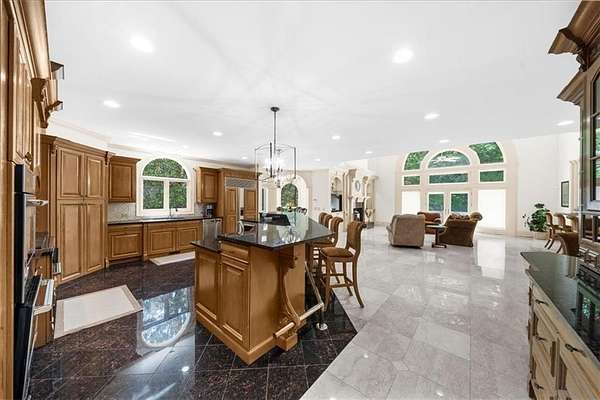 The expansive kitchen is a chef's dream--anchored by a large island and open to the family room--perfect for both everyday living and entertaining. With two dining rooms and two family rooms, there's space for every occasion. French doors lead to balconies overlooking the lush, park-like backyard and sparkling pool, creating a seamless connection between indoor and outdoor living.