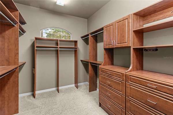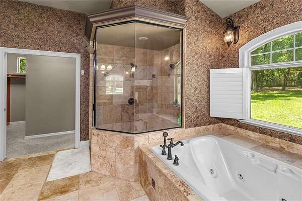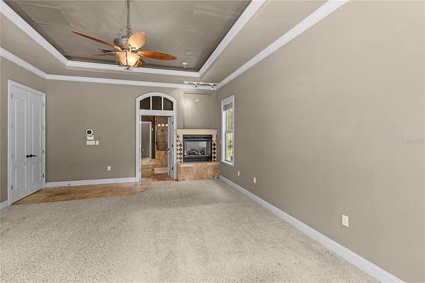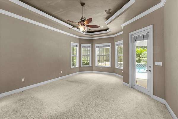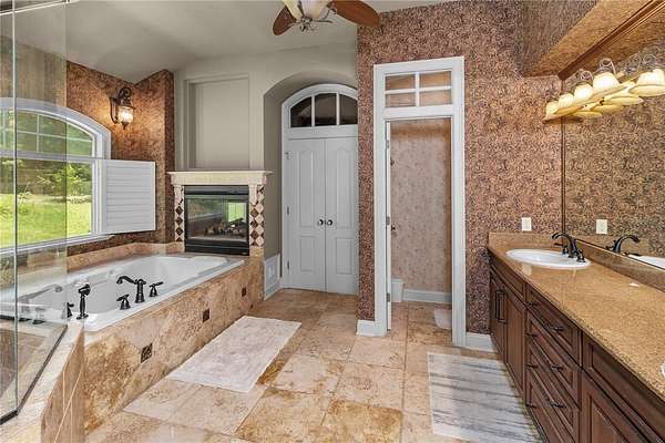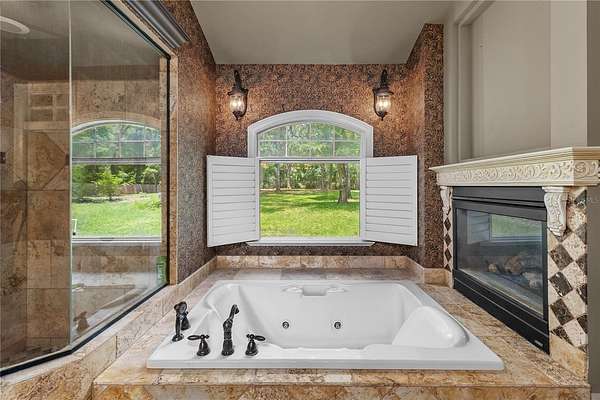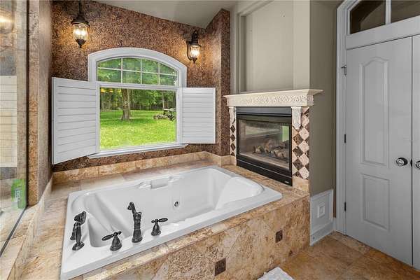 Master Suite Retreat: A serene escape complete with a two-sided fireplace, bay window with pool views, tray ceiling with cove lighting, surround sound, jetted tub, and a massive walk-in closet area.